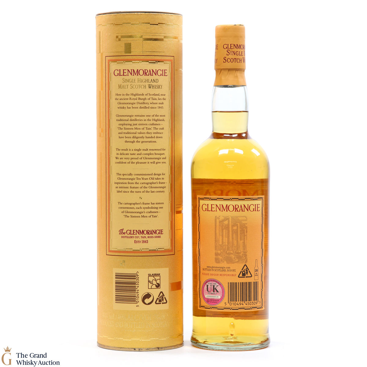 An older style bottling of Glenmorangie 10-year-old. Handcrafted by the sixteen men of Tain.