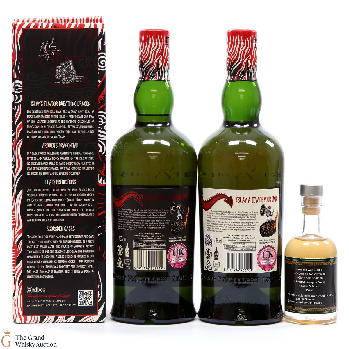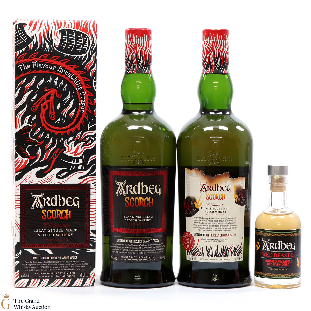 Included in this lot is 1 x Ardbeg - Scorch - Limited Edition 70cl, 1 x Ardbeg Scorch Committee Release and 1 x Ardbeg - Wee Beastie - Old Fashioned 10cl with a pouch of dry Pineapple.