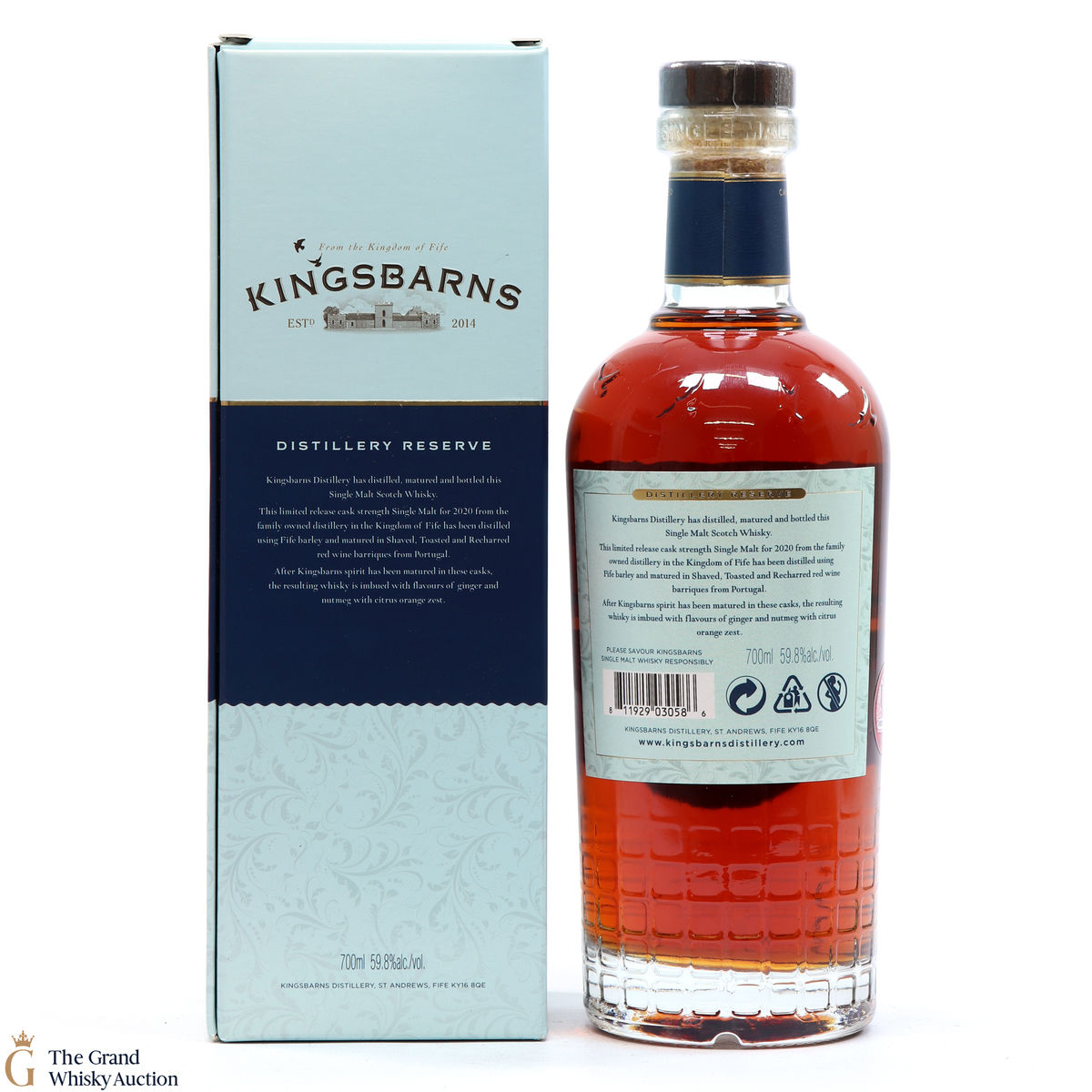 Distilled at the Kingsbarn Distillery, this limited release single malt was matured in shaved, toasted and recharred red wine barriques from Portugal. Bottled at the cask strength of 59.8% ABV, this is the 2020 Distillery Reserve.