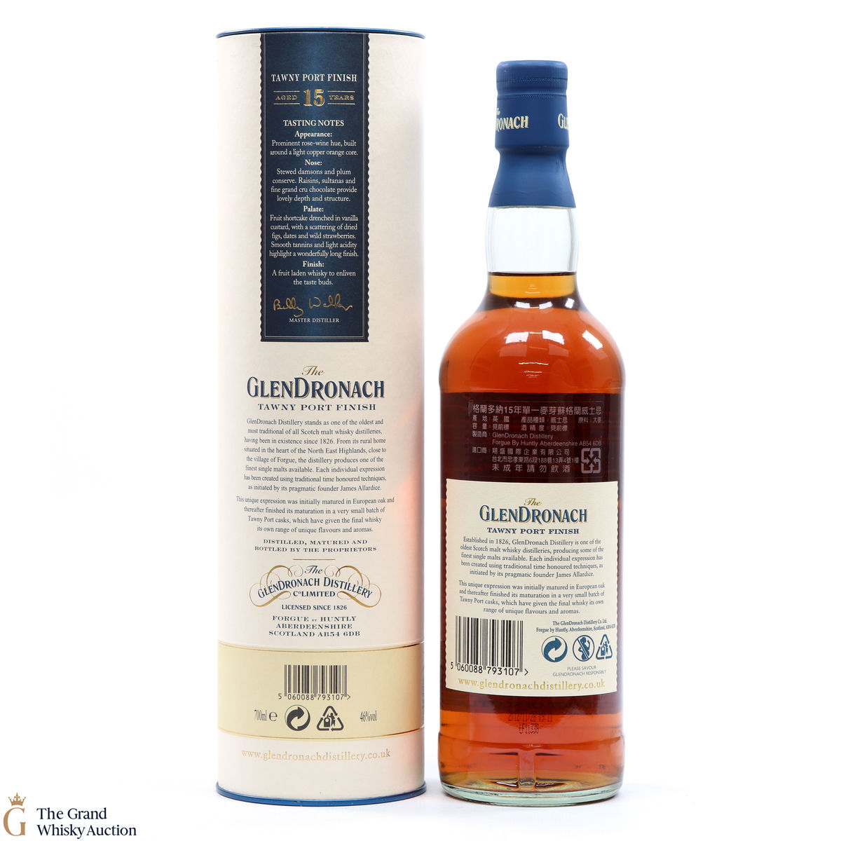 Distilled at Glendronach Distillery, this single malt underwent maturation initially in a European oak cask before being finished in a very small batch of Tawny Port casks for a total of 15 years before being bottled at 46% ABV.