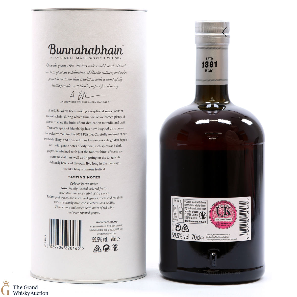 Bunnahabhain's first release for Feis Ile 2021 is this limited edition smoky whisky. Distilled on the 10th of October 2013, this single malt was finished in Moine Bordeaux casks which gives the Bunnahabhain a delicately balanced flavour. Bottled on the 25th of November 2020, this is one of only 5166 bottles produced.
