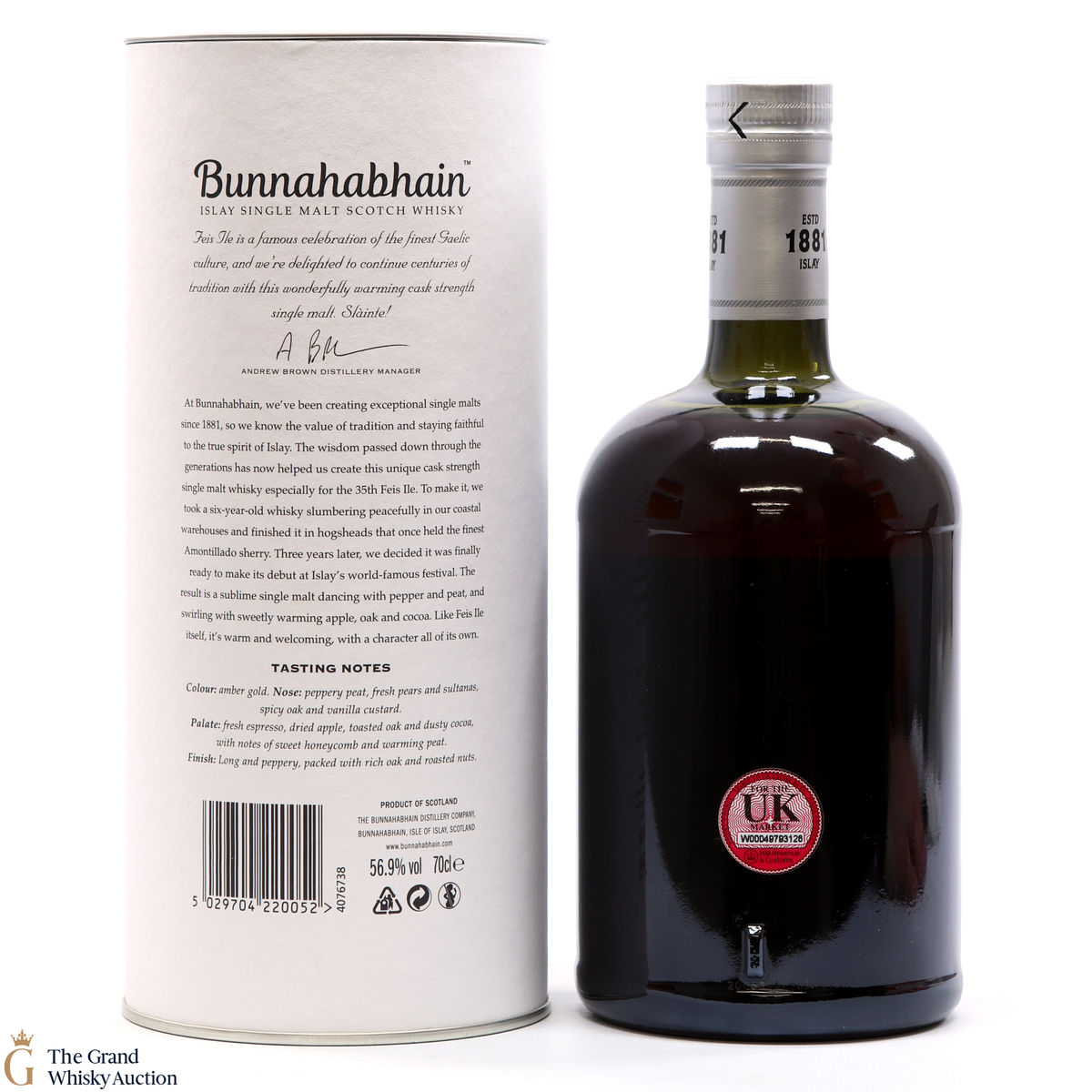 This limited edition single malt from Bunnahabhain Distillery was matured for 6 years in classic bourbon barrels, after which the single malt was transferred to Amontillado sherry Hogsheads for another three years. It was bottled at 56.9% and was released by Bunnahabhain for Fèis Ìle 2020. This is one of only 1658 bottles produced.