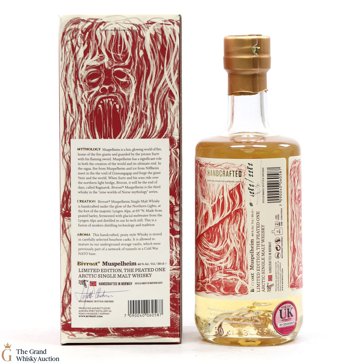 This is a limited edition bottle created in Arctic Norway was 'handcrafted under the Northern Lights'. This is a limited edition - The Peated One. Muspelheim is one of the Nine Worlds of Norse mythology - a hot and glowing land of fire, home to the fire giants and guarded by the jotunn Surtr with his flaming sword. This is a 50cl bottling.