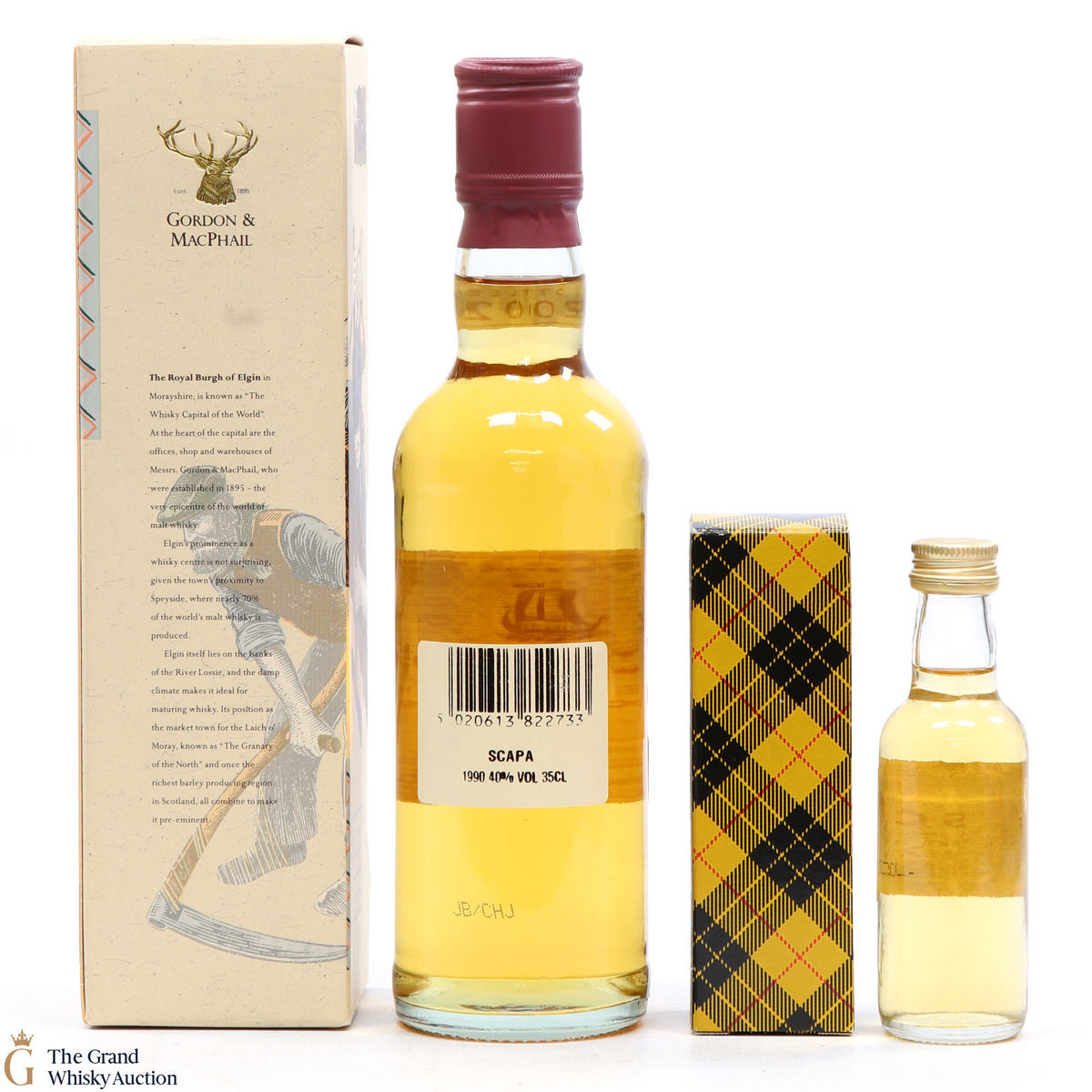 This a 1990 vintage Scapa selected, produced, matured and bottled by Gordon & MacPhail. This lot contains both a 35cl bottling and a 5cl.