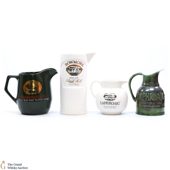 A set of 4 branded ceramic water jugs from different distilleries in Islay -