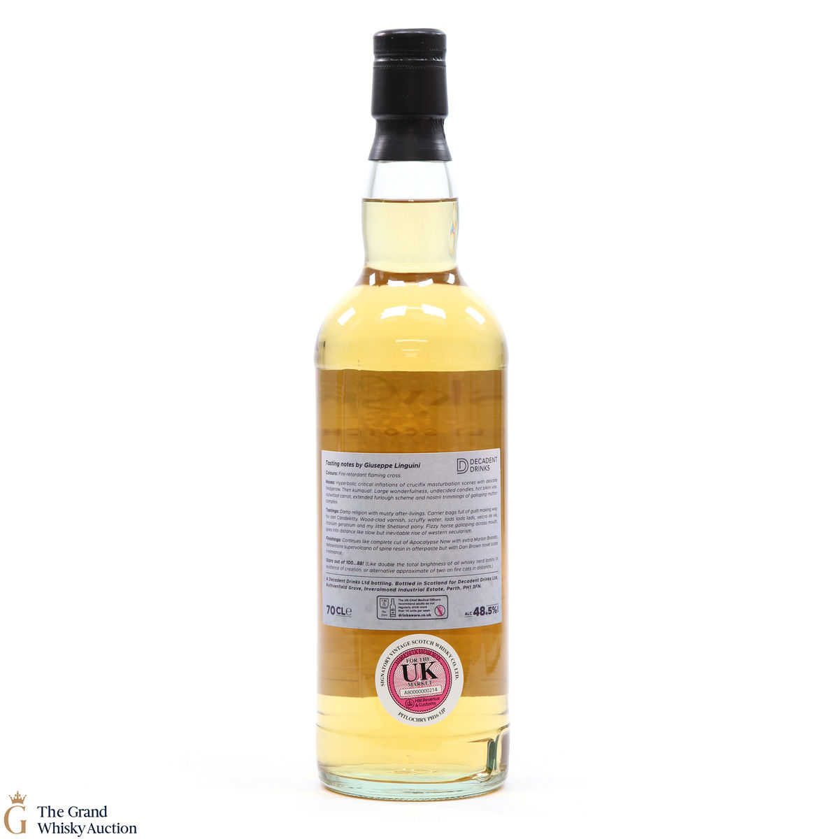 Due to the various ages of bottles and their seals, the condition of liquid is at the buyer's discretion and no claim can be lodged against failure/leakage in transit. Loss and breakage cover is available at 3% of the hammer price as standard. If the lot is not insured, no claim can be lodged against the courier or The Grand Whisky Auction for breakage or loss in transit.