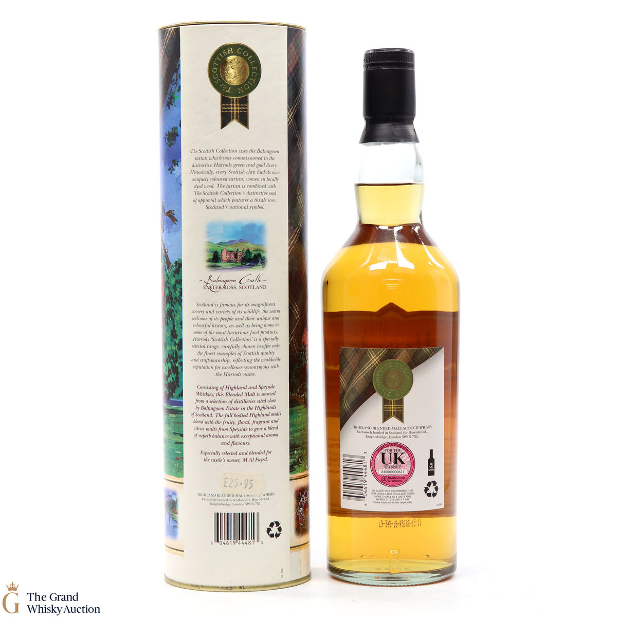 A bottle of Harrod's Balnagown blended scotch whisky is a non-age statement Highland & Speyside malt. This bottling is named after the Balnagown Estate in the Highlands of Scotland, which has been owned by Mohammad Al Fayed (former Chairman of Harrods) since the early 1970s.