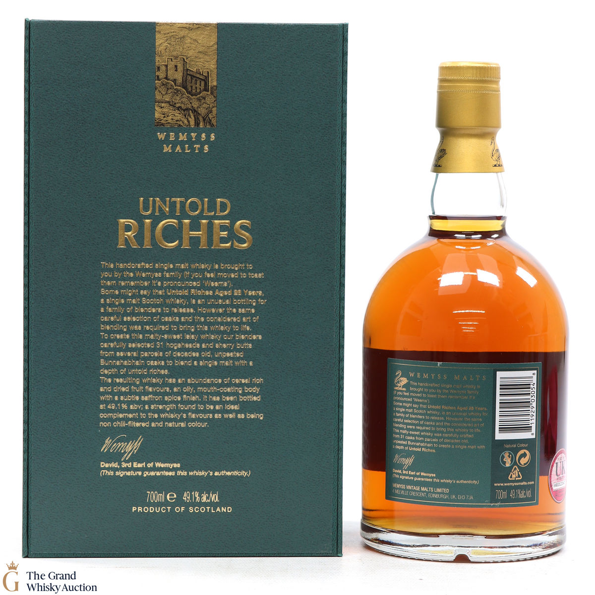 This handcrafted single malt is brought to you by the Wemyss family. Distilled at Bunnahabhain distillery, the Untold Riches 28 Year Old is a single malt held in hogsheads and sherry butts from several parcels of decades old, unpeated Bunnahabhain casks.