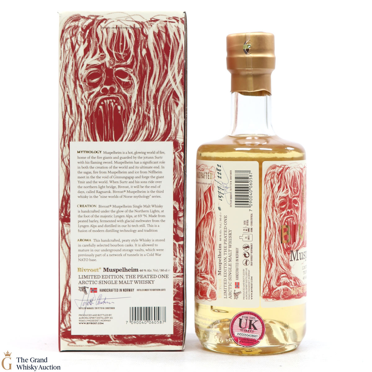 This is a limited edition bottle created in Arctic Norway was 'handcrafted under the Northern Lights'. This is a limited edition - The Peated One. Muspelheim is one of the Nine Worlds of Norse mythology - a hot and glowing land of fire, home to the fire giants and guarded by the jotunn Surtr with his flaming sword. This is a 50cl bottling.