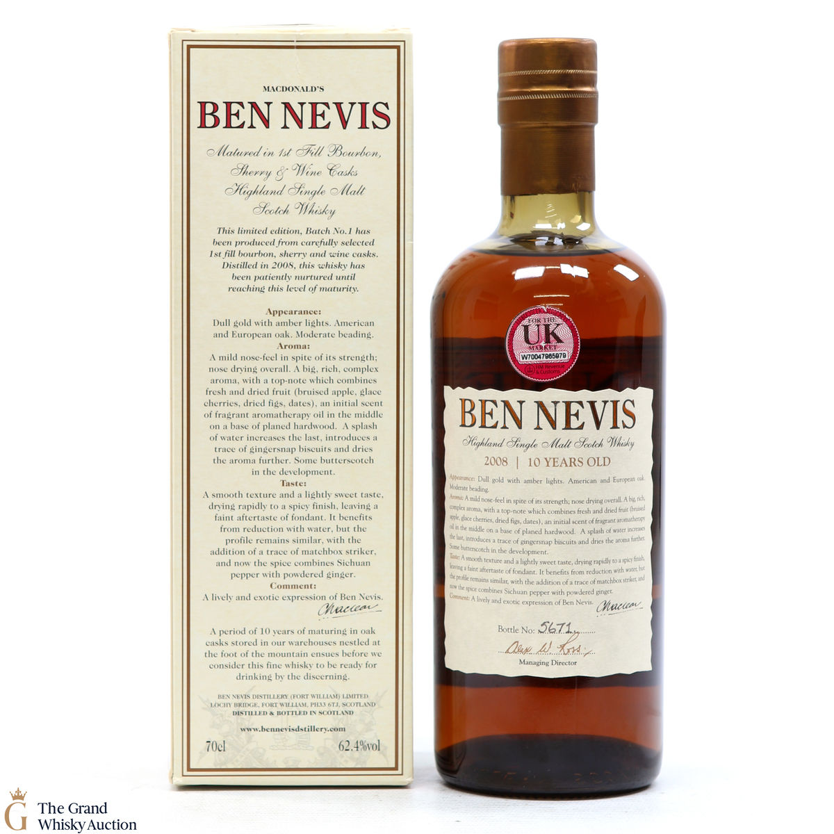 Due to the various ages of bottles and their seals, the condition of liquid is at the buyer's discretion and no claim can be lodged against failure/leakage in transit. Loss and breakage cover is available at 3% of the hammer price as standard. If the lot is not insured, no claim can be lodged against the courier or The Grand Whisky Auction for breakage or loss in transit.
