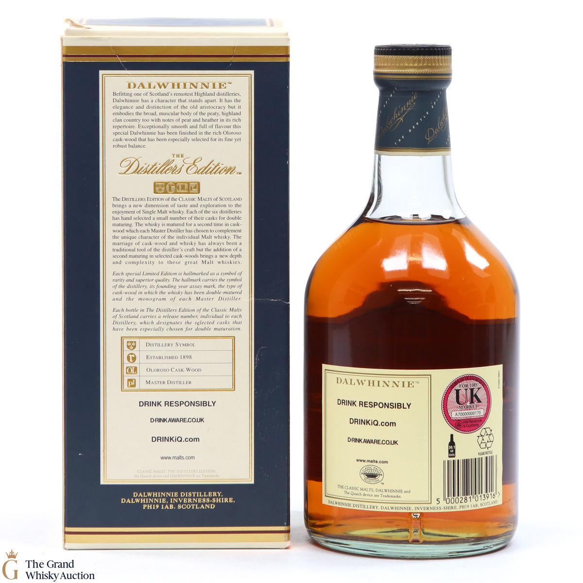 Due to the various ages of bottles and their seals, the condition of liquid is at the buyer's discretion and no claim can be lodged against failure/leakage in transit. Loss and breakage cover is available at 3% of the hammer price as standard. If the lot is not insured, no claim can be lodged against the courier or The Grand Whisky Auction for breakage or loss in transit.
