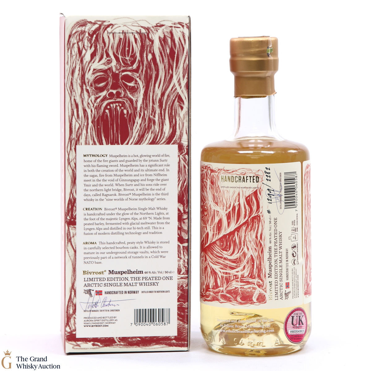 This is a limited edition bottle created in Arctic Norway was 'handcrafted under the Northern Lights'. This is a limited edition - The Peated One. Muspelheim is one of the Nine Worlds of Norse mythology - a hot and glowing land of fire, home to the fire giants and guarded by the jotunn Surtr with his flaming sword. This is a 50cl bottling.