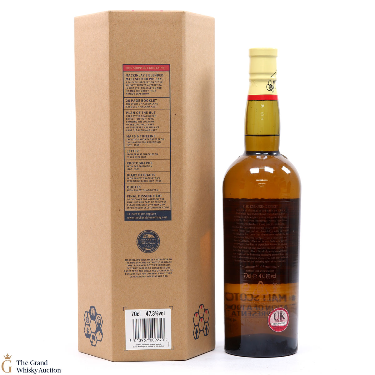 This rare old blend of highland single malts is blended and bottled by Mackinlay & Co. The Journey edition of the Shackleton is a recreation of a 1907 whisky and its presentation that has been specially prepared for the British Antarctic Expedition which was led by the ship 'Endurance'.