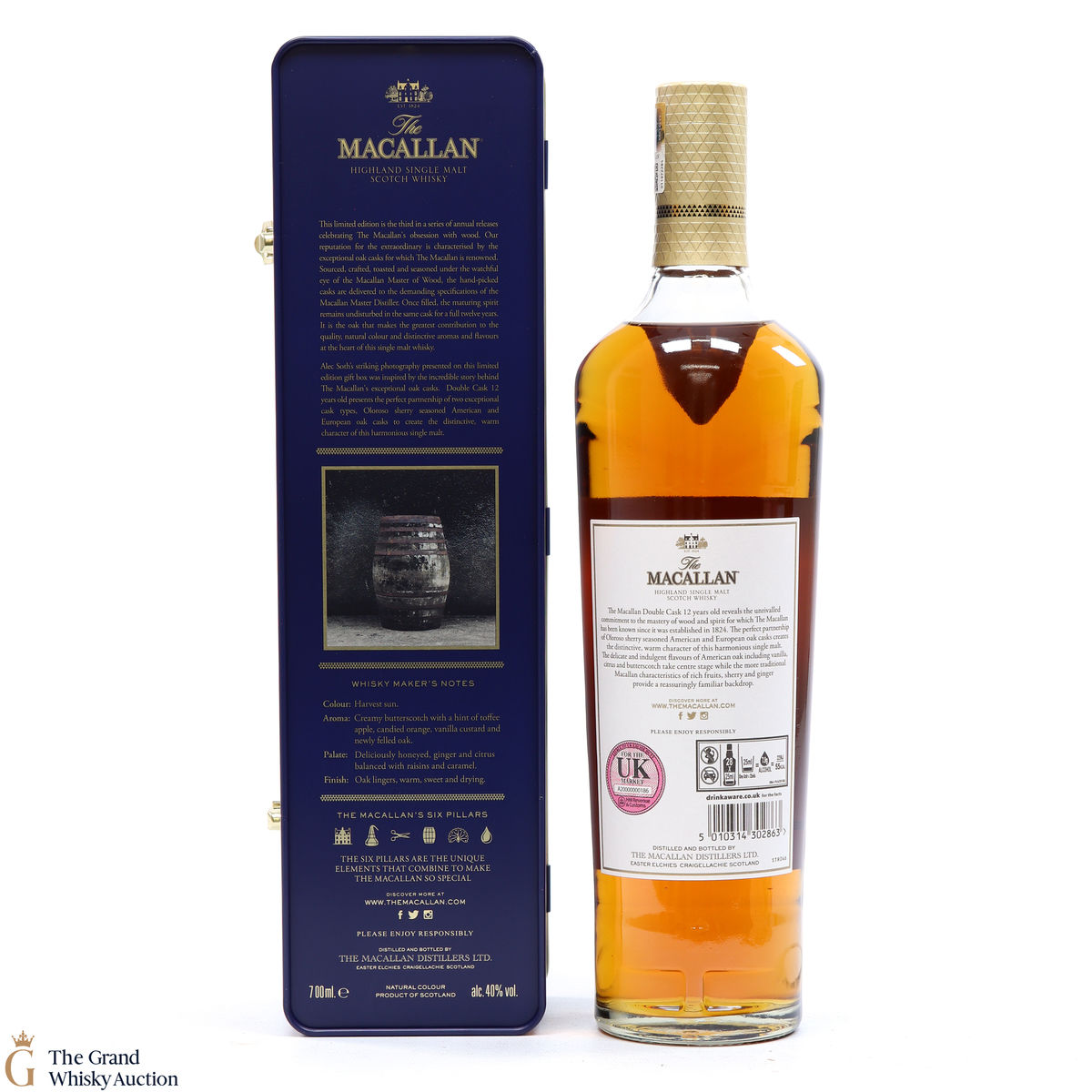 This Macallan 12 Year Old Double Cask matured in a mixture of European and American oak casks that have previously contained Sherry, as well as American oak casks which have contained Bourbon. It comes presented in a limited edition tin.
