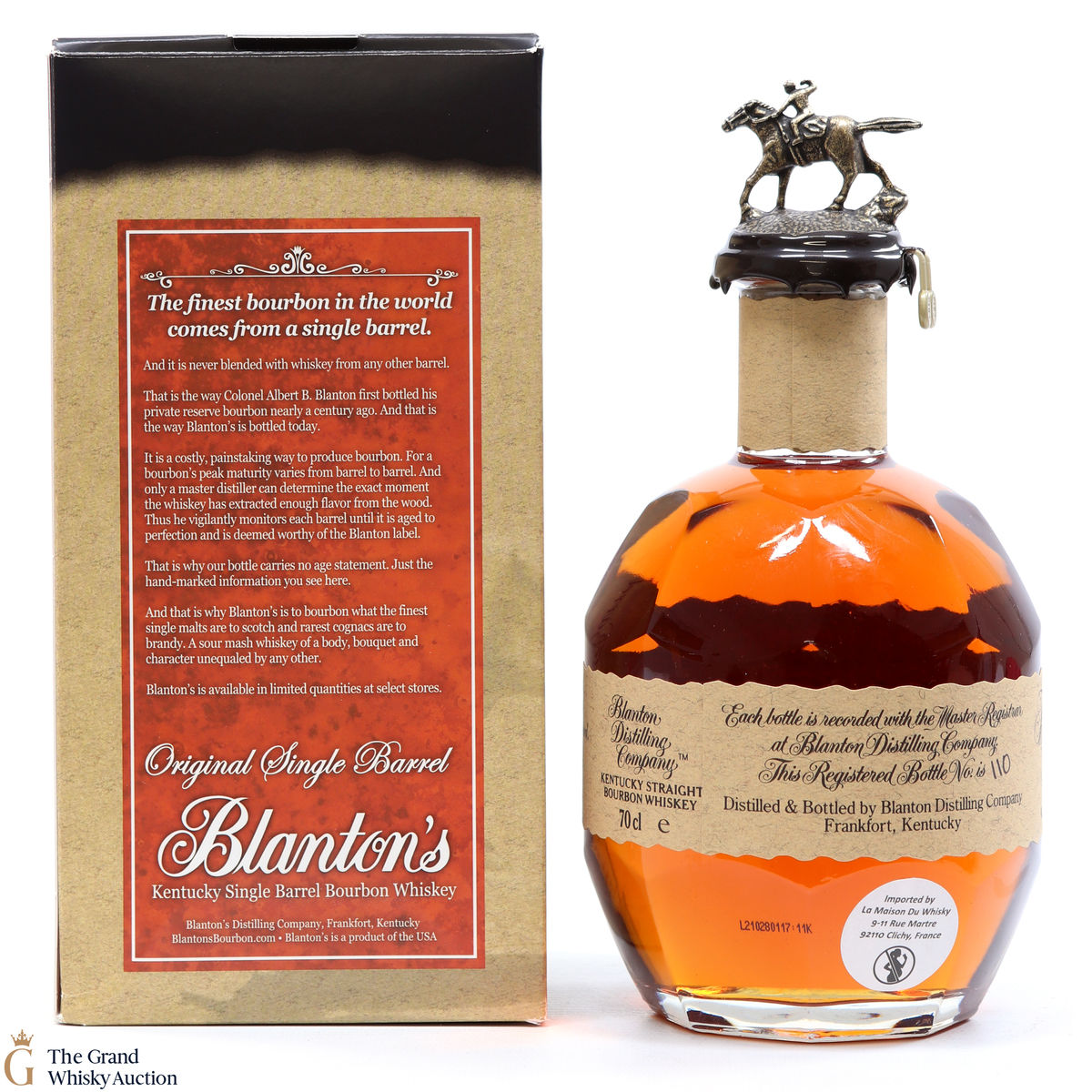 Blanton's Single Bourbon is normally 6 to 8-year-old bourbon, aged in Warehouse H at Buffalo Trace in the metal-clad warehouse at the distillery. The metal, transfers heat quicker than brick warehouses, allowing for faster ageing.