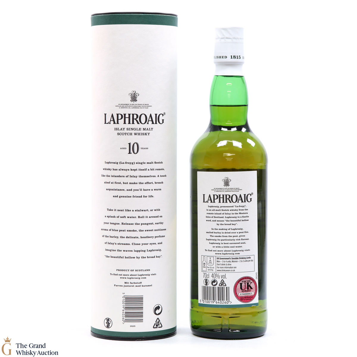 A 70cl of the medicinal 10 year old from Islay's bestselling distillery, Laphroaig. In making Laphroaig, malted barley is dried over a peat fire. The smoke from this peat, found only on Islay, gives Laphroaig its particularly rich flavour.