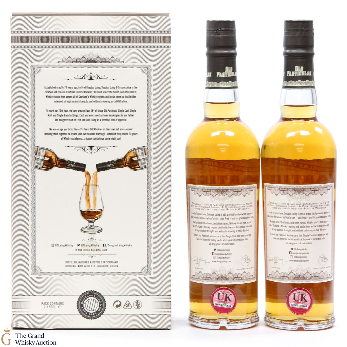 A fantastic and rare lot from Douglas Laing's Old Particular range, this combination of a 35 Year Old Caol Ila and Cambus, was bottled to celebrate Douglas Laing's 70th Anniversary. Included in this lot is 2 x 50cl bottlings: