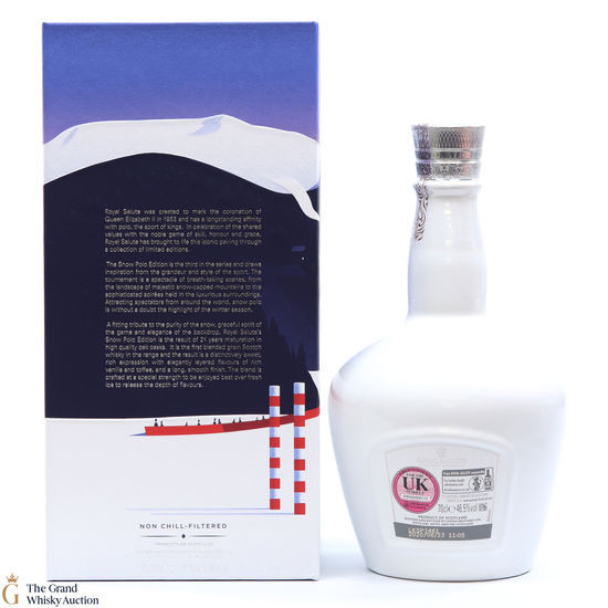 A fitting tribute to the purity of the snow, graceful spirit of the game, and elegance of the backdrop, Roya Salute's Snow Polo Edition is the result of 21 years of maturation in high-quality oak casks.