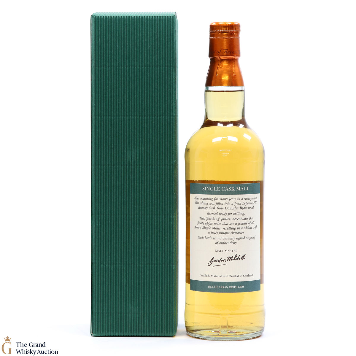 Distilled off the West Coast of Scotland at the Isle of Arran Distillery, this single malt was finished in a Lepanto PX Brandy Cask from Gonzalez Byass before being bottled at 59.3% ABV on the 19th of January 2006.
