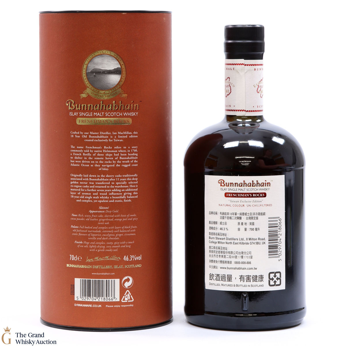 An 18 year old Taiwanese limited edition crafted by Bunnahabhain's master distiller Ian Macmillan. The 'Frenchman''s Rocks' comes from a story traditionally told by the native helmsman.