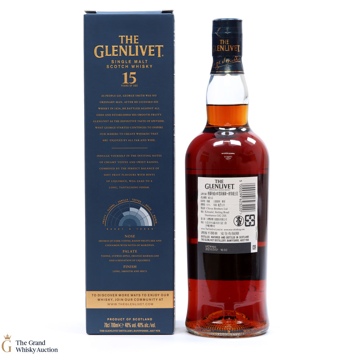 Distilled at the Glenlivet Distillery, this single malt was aged exclusively in rare oloroso sherry casks for 15 years, the result is a perfect balance of sweet spices and raisin. This spirit was bottled exclusively for Taiwan.