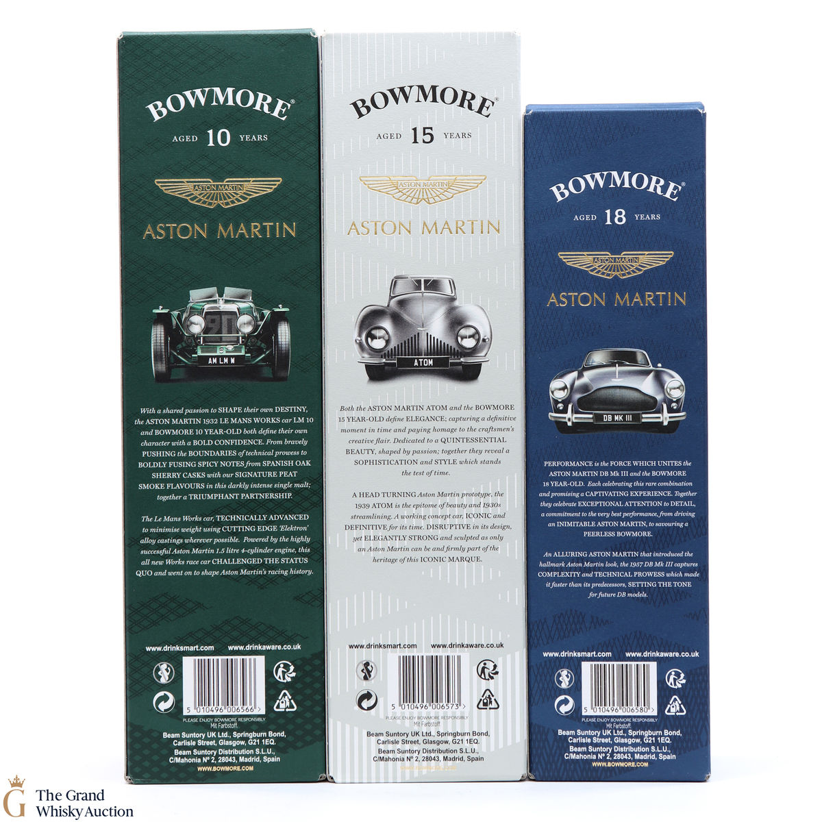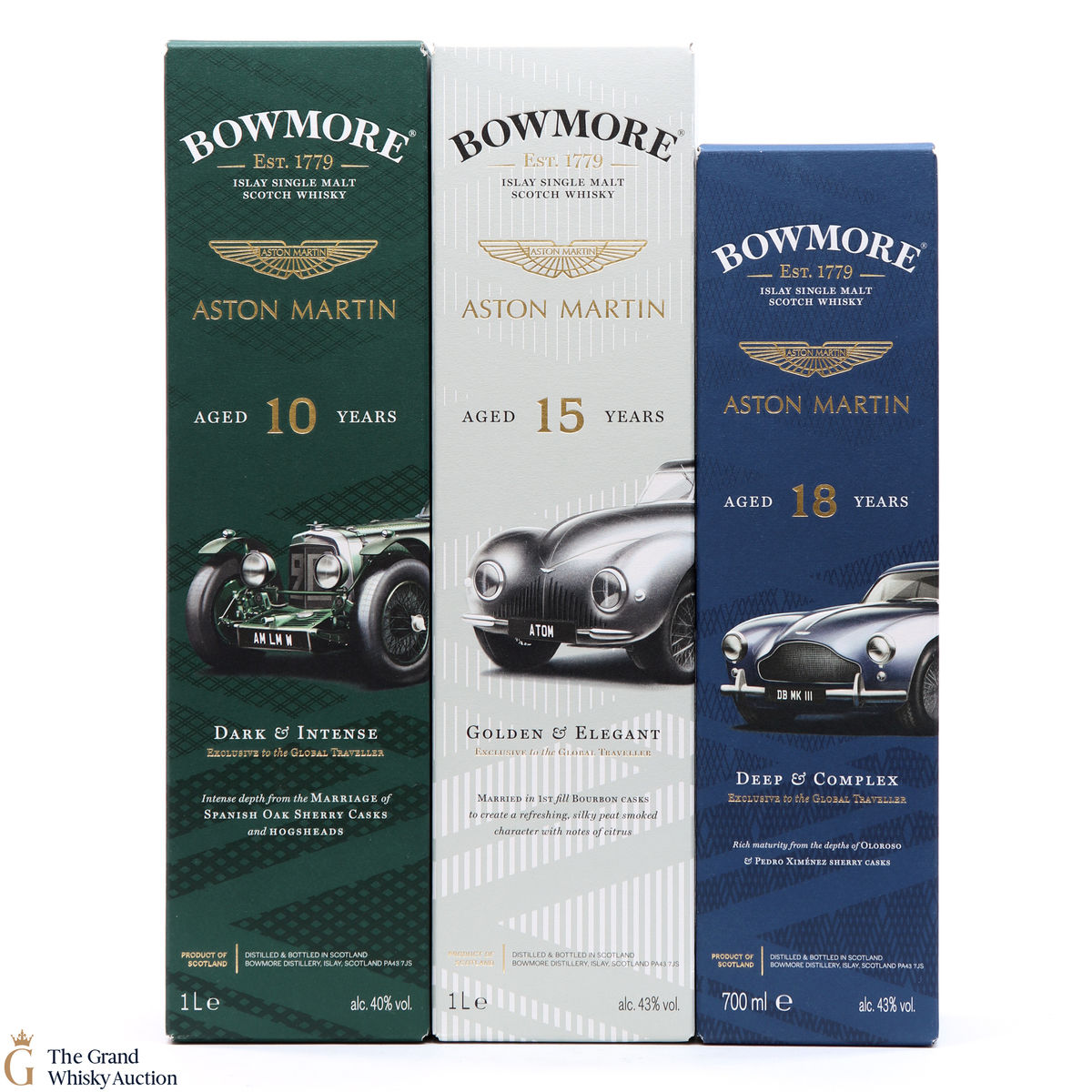 The full collection of the collaboration between Bowmore and Aston Martin, both creating timeless beauty and a lasting legacy. Each edition of the Aston Martin collection features a different car. Included in this lot is edition 1, 2 and 3: