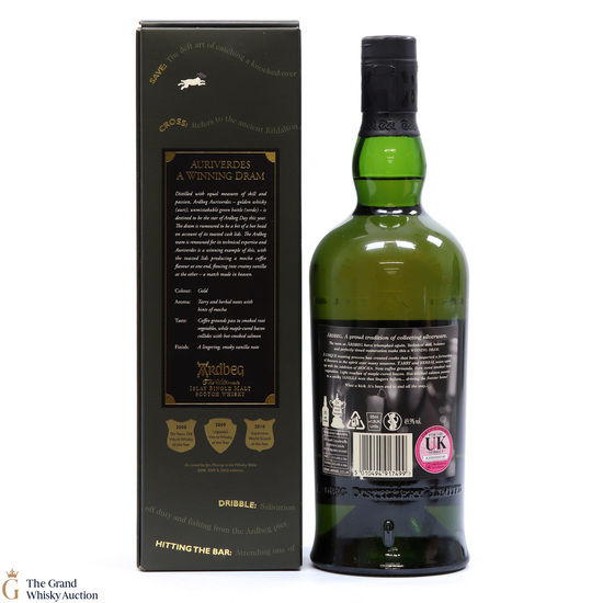 This special edition Ardbeg single malt was released on Ardbeg Day 2014. during Feis Ile. Auri(Gold) verdes (Green) it refers to the golden whisky and the iconic Ardbeg green bottle of Ardbeg whisky. It is said to be a dram of two halves - the whisky uses toasted cask lids to create Mocha Coffee flavours that team up with creamy vanilla.