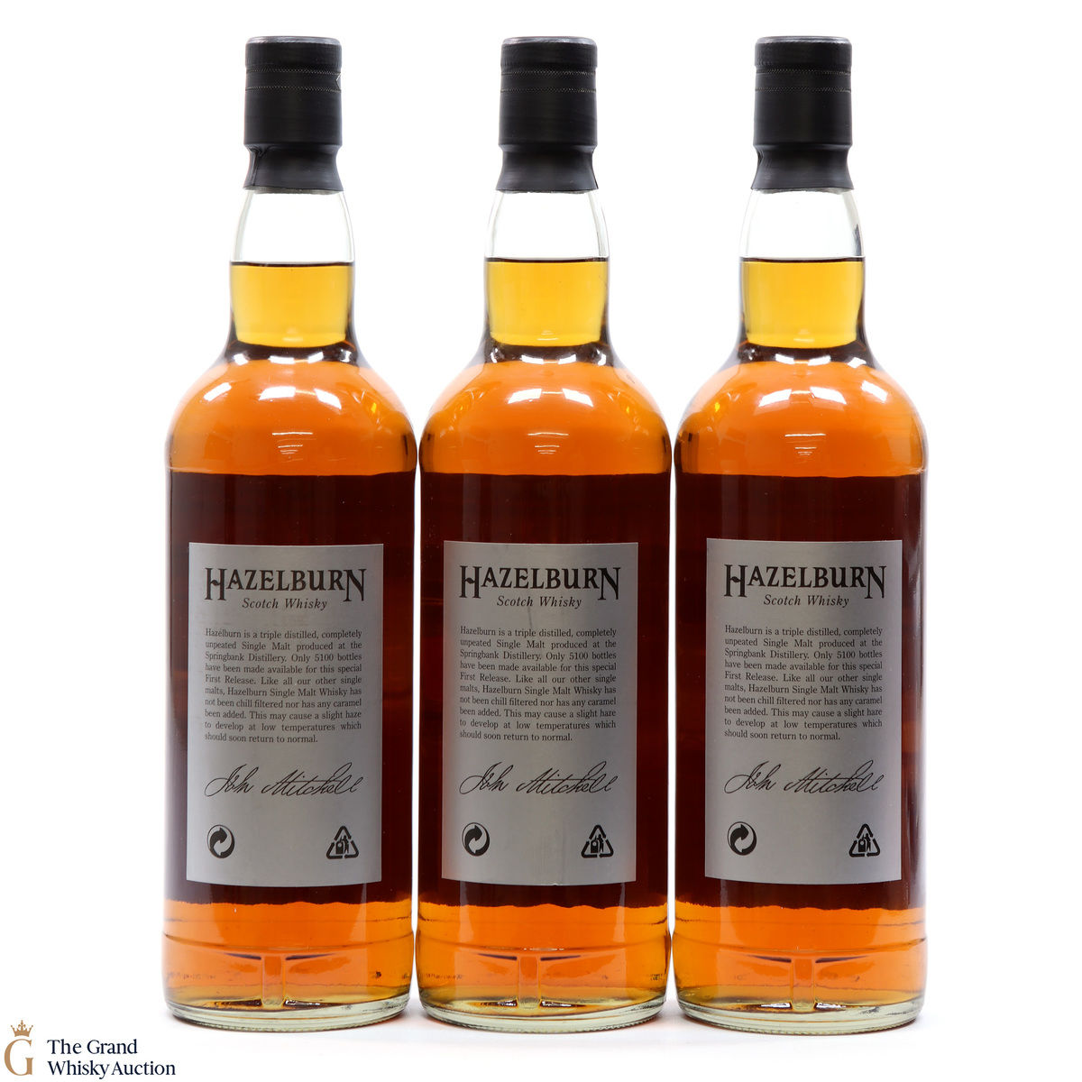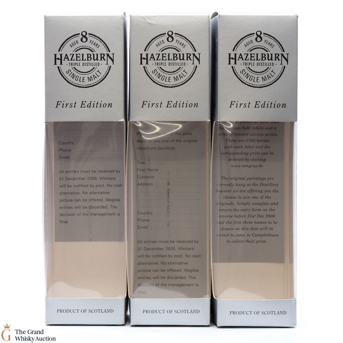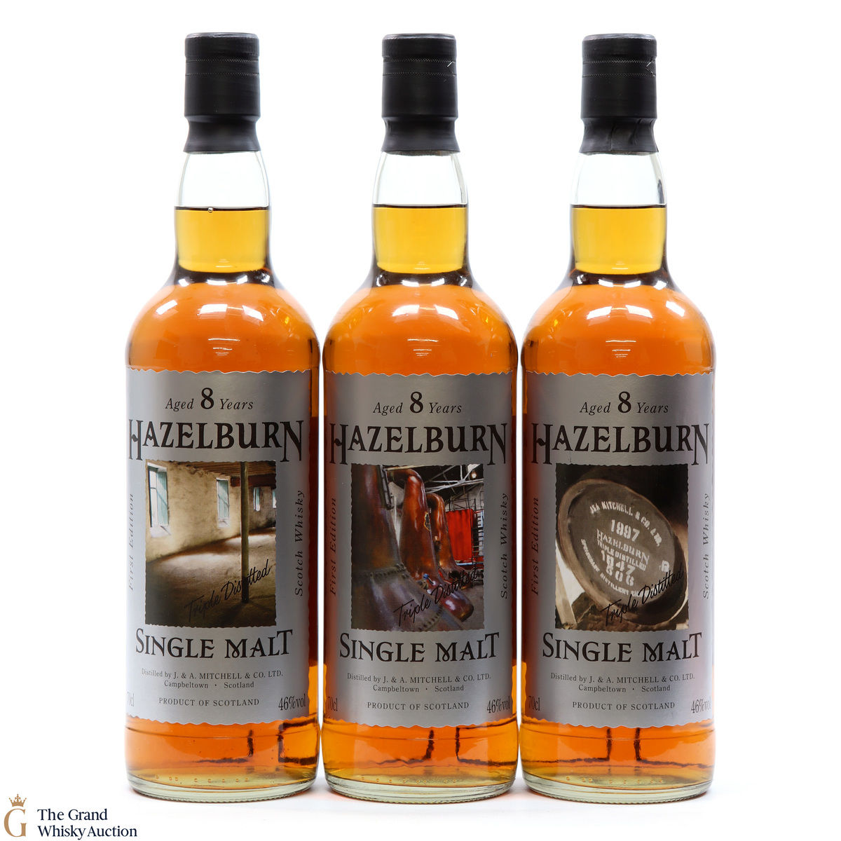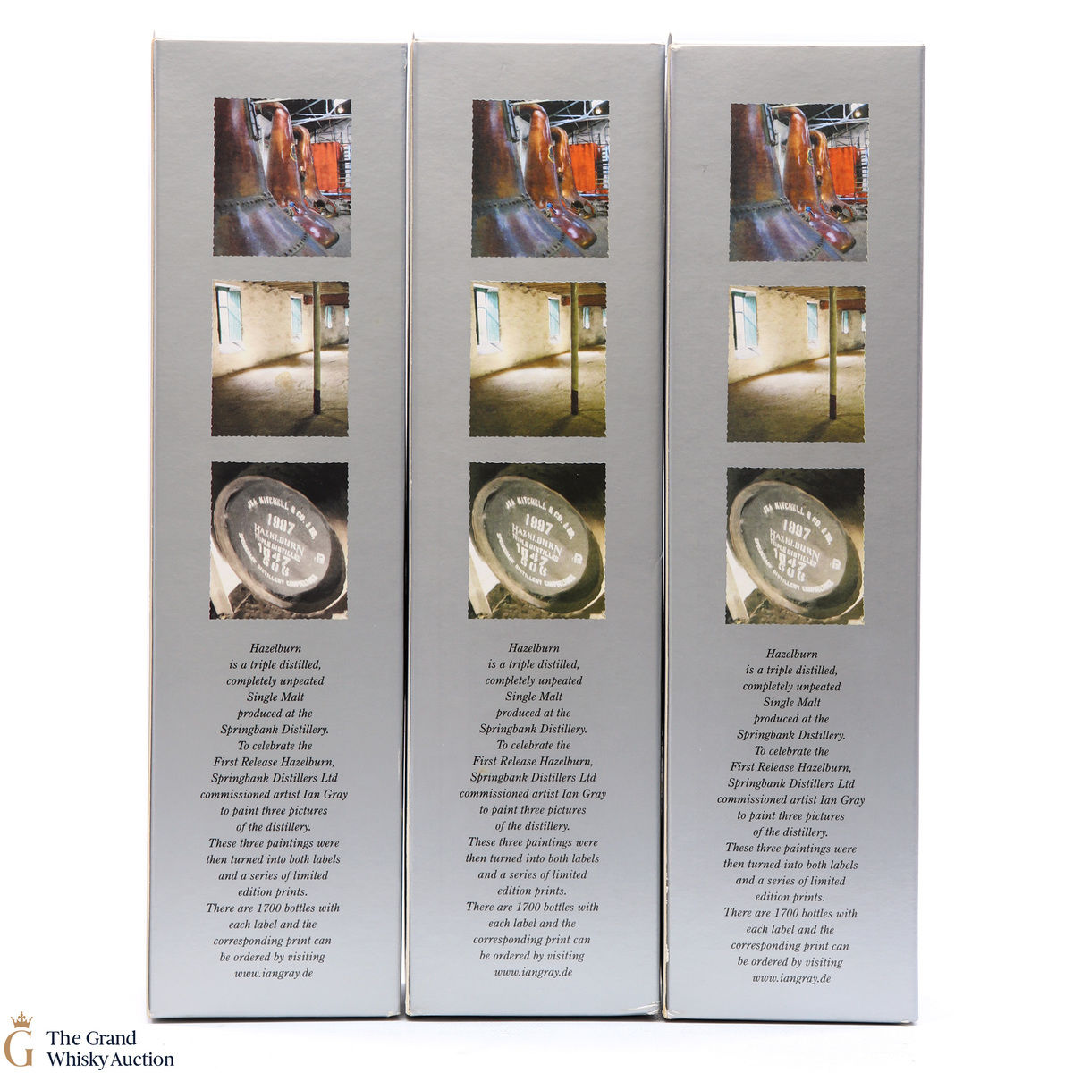 This lot has 3 x 70cl bottles of Hazelburn which is a triple distilled, completley unpeated single malt produced at Campeltown's Springbank Distillery. To celebrate the First Release Hazelburn, Springbank Distillers Ltd commissioned artist Ian Gray to paint 3 pictures of the distillery. These 3 paintings were then turned into both labels and a series of limited edition prints.