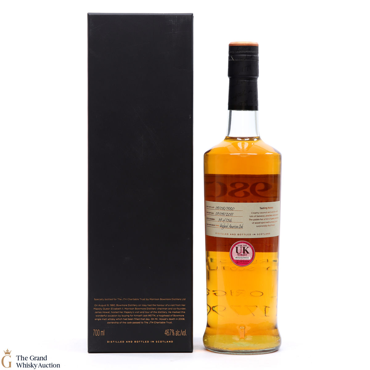 This bottling was specially selected and bottled for the JTH Charitable trust by Morrison Bowmore distillers. In 1980 August 9th Bowmore had the privilege and honour of a visit from her majesty the Queen Elizabeth II.