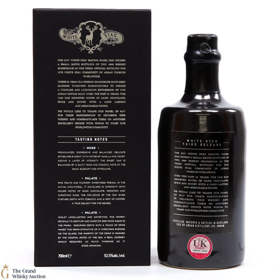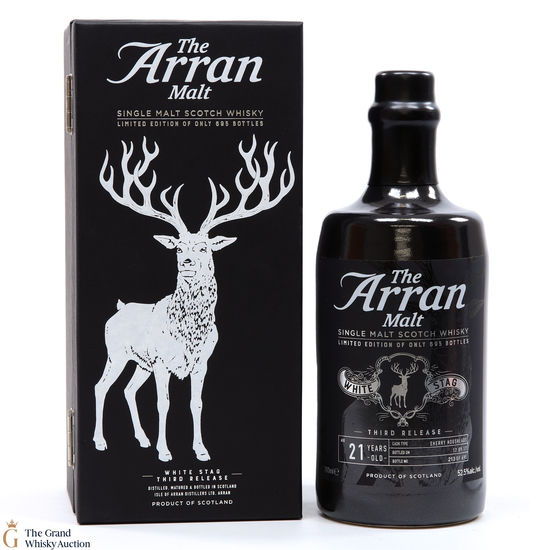 Distilled at the Isle of Arran Distillery, this single malt was aged for 21 years in Sherry hogsheads before being bottled on the 12th of September 2017 at 52.5% ABV. This is the 3rd release in the White Stag Series which is limited to just 695 bottles.