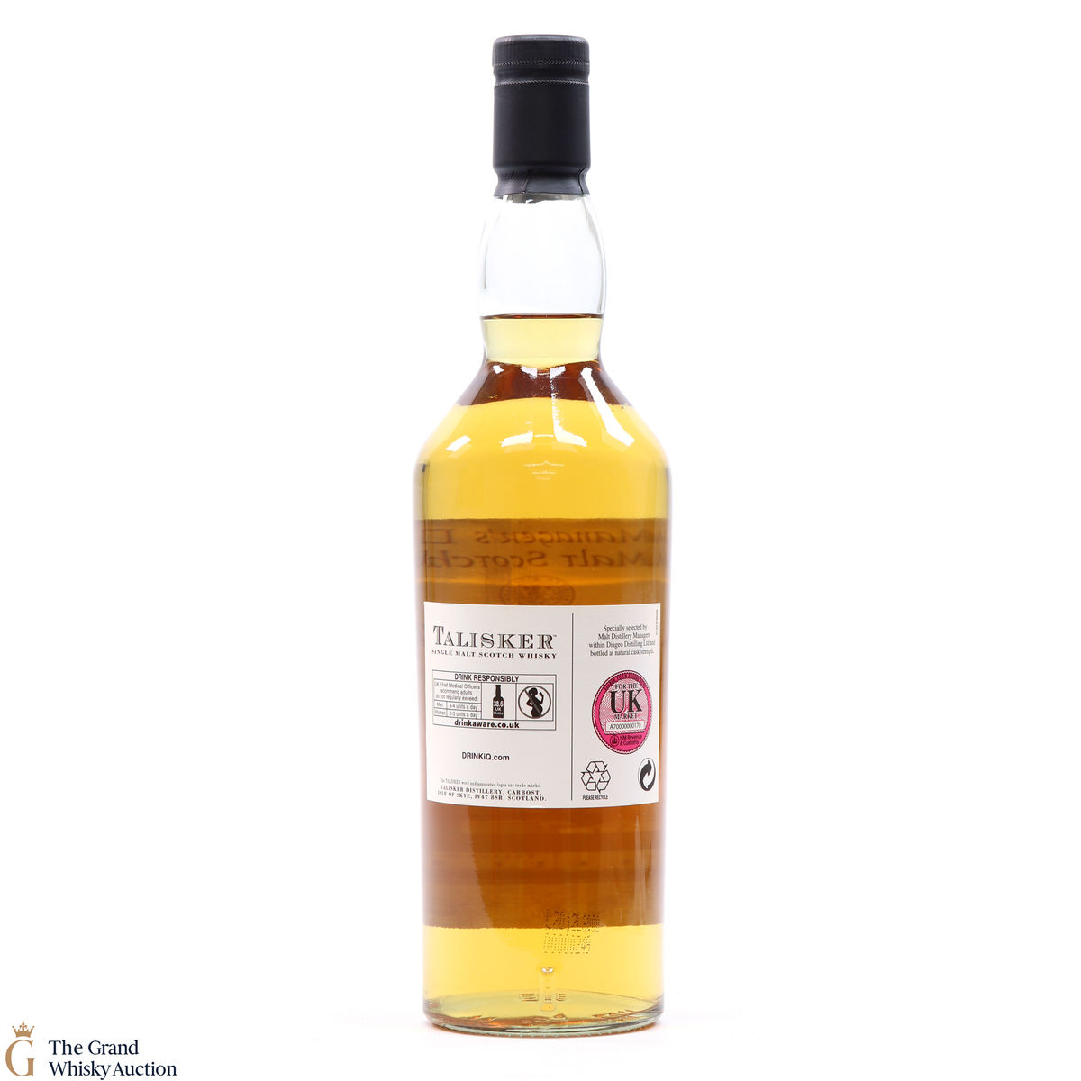 A rare Talisker single malt whisky bottled in 2011 for Diageo staff, at natural cask strength. The malt was specially selected by distillery managers within Diageo and bottled at 55.2%. This is an individually numbered bottle.
