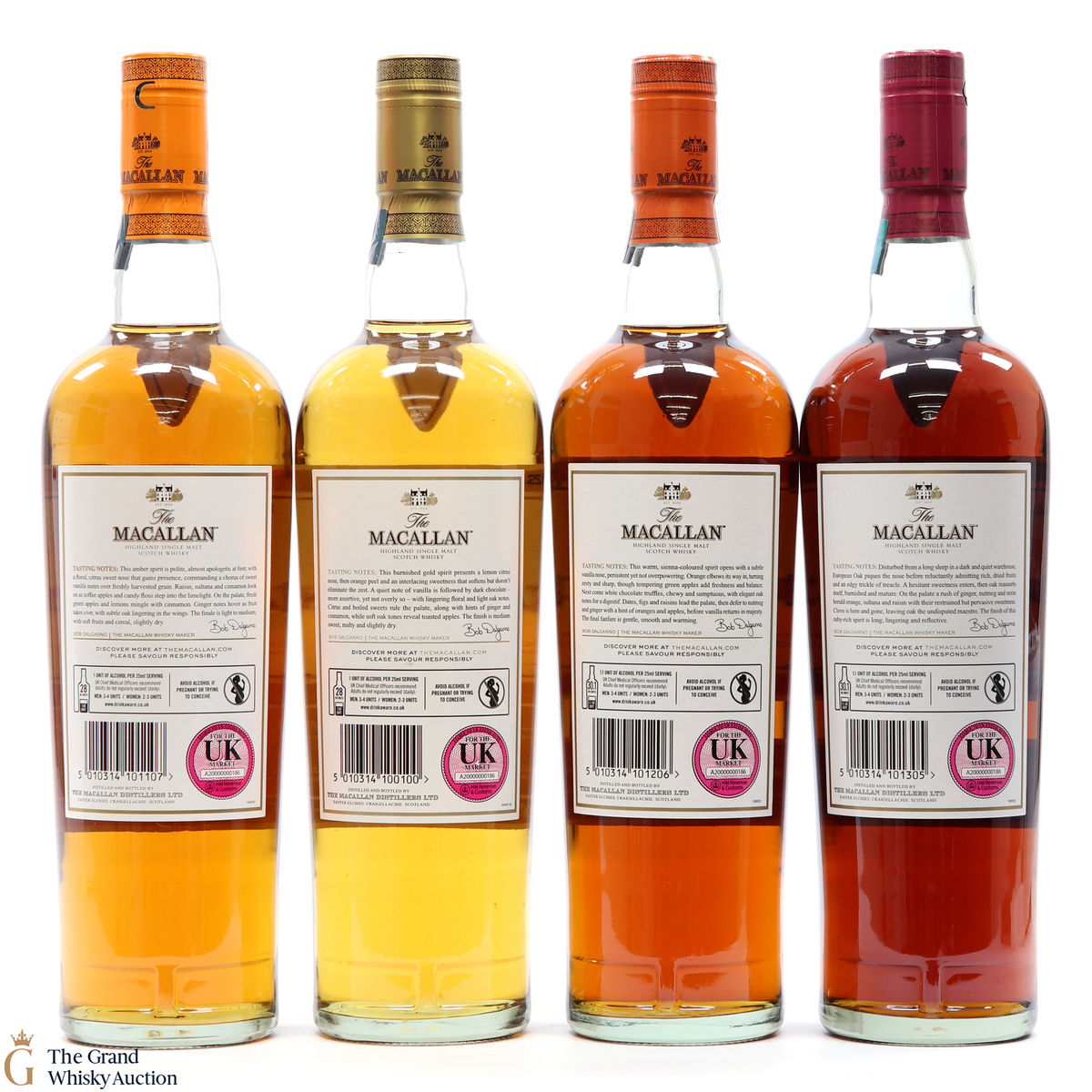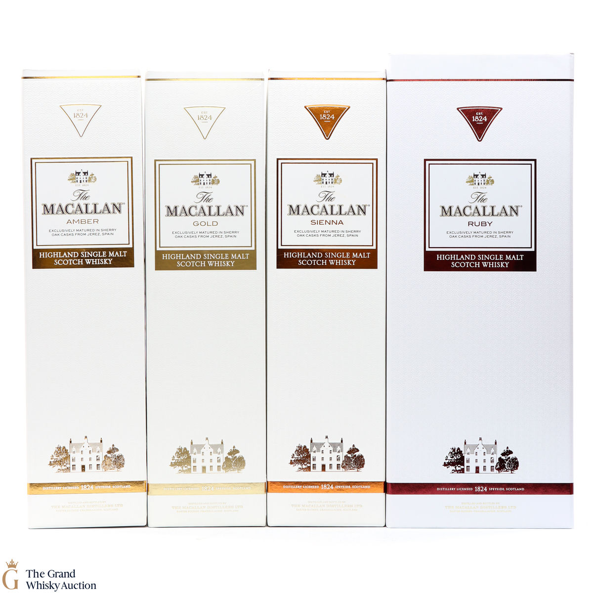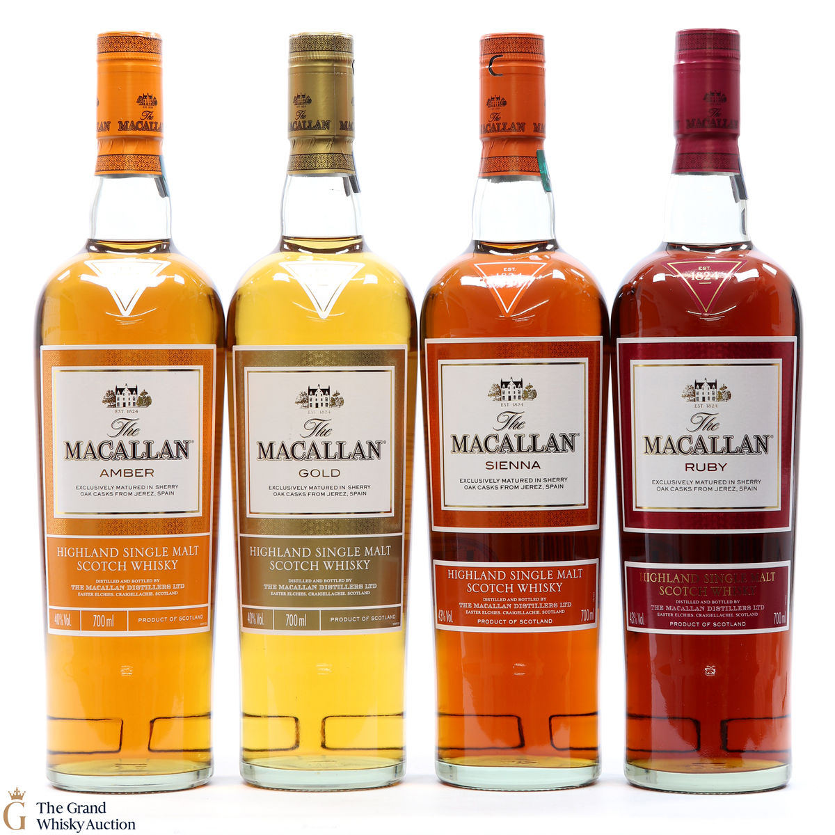 - Macallan - Sienna: a no age statement bottling. Matured in top quality sherry casks, this single malt is named Sienna to represent the naturally occurring pigment - referring not only to the hue of this expression but to the fact that The Macallan's whiskies are all released with no added colouring. 43% ABV, 70cl.