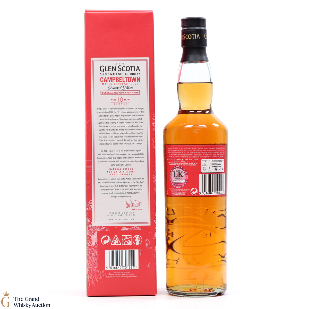 Distilled at Glen Scotia distillery, this limited edition malt was matured in 100% first fill bourbon barrels before being finished in Bourdeaux red wine casks. This bottling was specifically for the Campbeltown Malt Festival 2021 and is the first unpeated release.