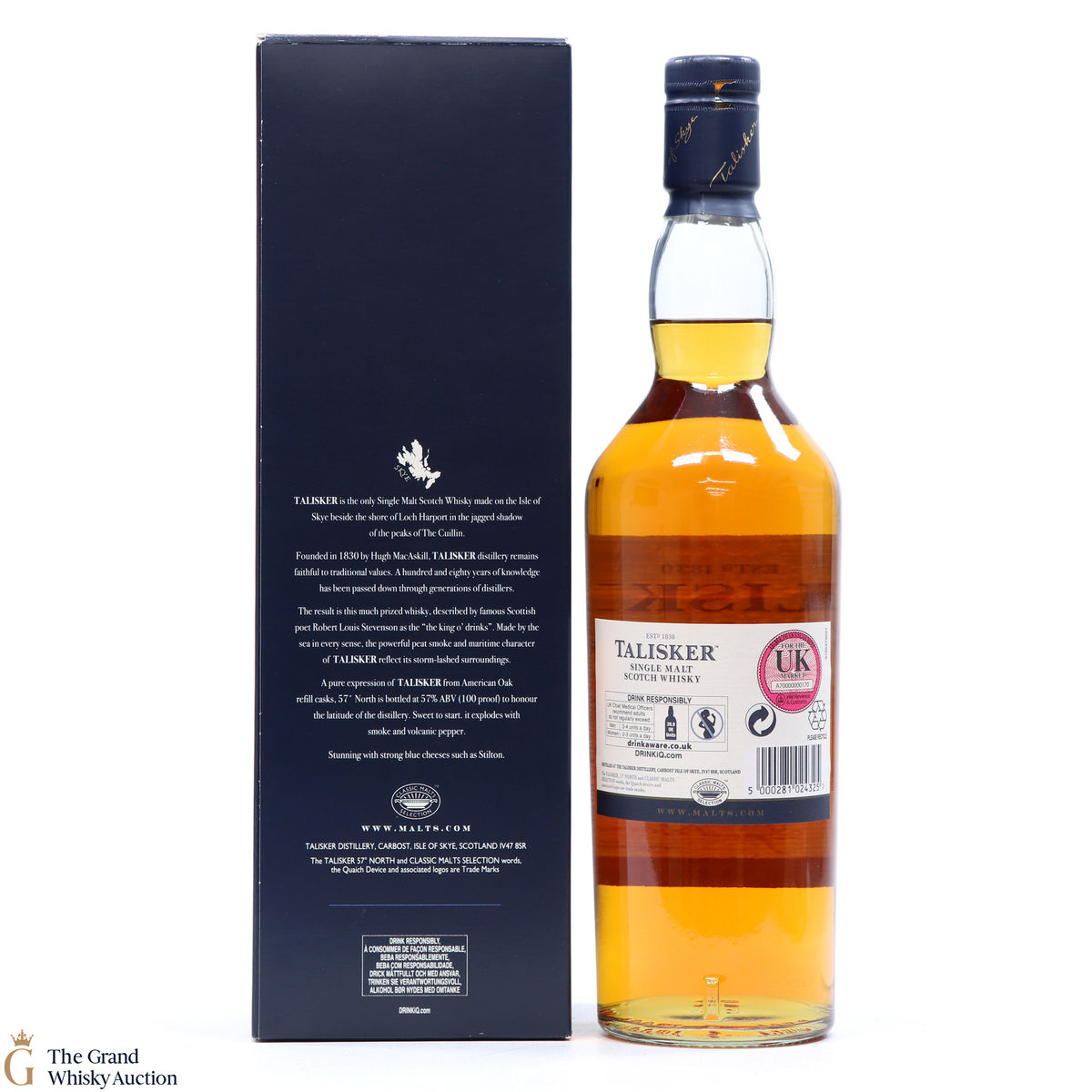 Distilled at the popular Talisker Distillery, the only distillery on the Isle of Skye, this single malt was bottled at the special strength of 57% ABV, matching the name of this malt.