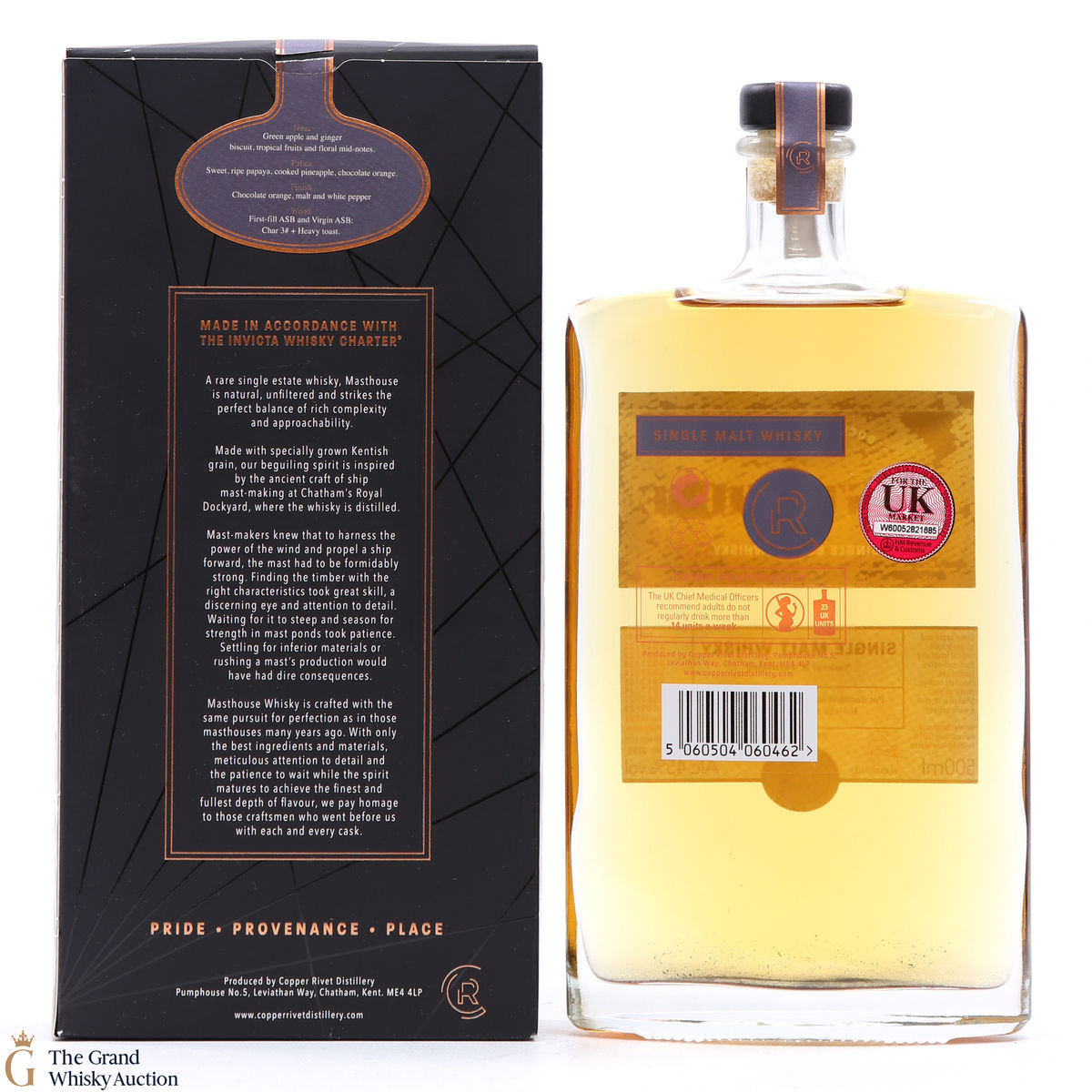 Masthouse Single Malt, made in accordance with the distillery's very own Invicta Whisky Charter. This expression is distilled from Kentish malted barley from the nearby Isle of Sheppey, and was aged in a combination of ex-bourbon and virgin American white oak barrels.