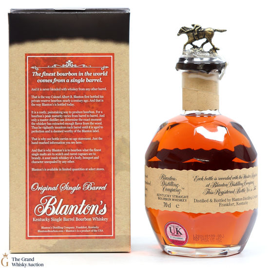 Blanton's Single Bourbon is normally 6 to 8-year-old bourbon, aged in Warehouse H at Buffalo Trace in the metal-clad warehouse at the distillery. The metal, transfers heat quicker than brick warehouses, allowing for faster ageing.