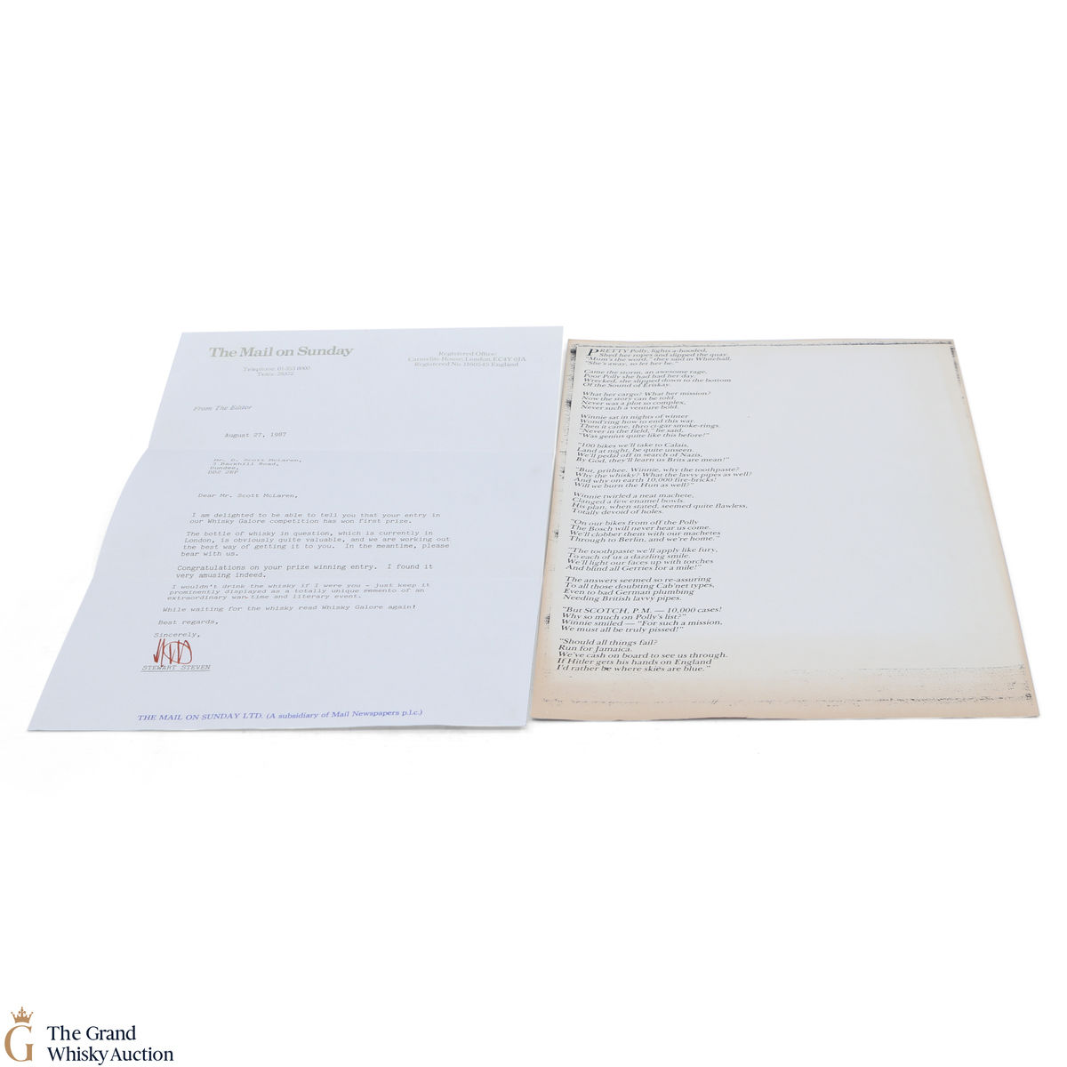 This lot includes the newspaper clippings of the story, competition entry requirements, newspaper confirmation of the winner, the winning poem, letter to the winner, photo of the winner and of course the bottle itself.
