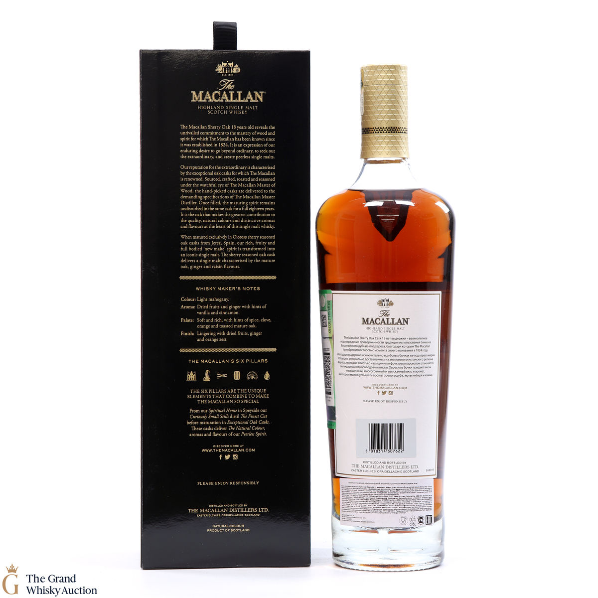 This annual release of The Macallan's popular 18 Year Old Sherry Oak is matured exclusively in sherry seasoned casks, built from both Spanish and American oak, providing a beautifully dark flavour with rich aromas.