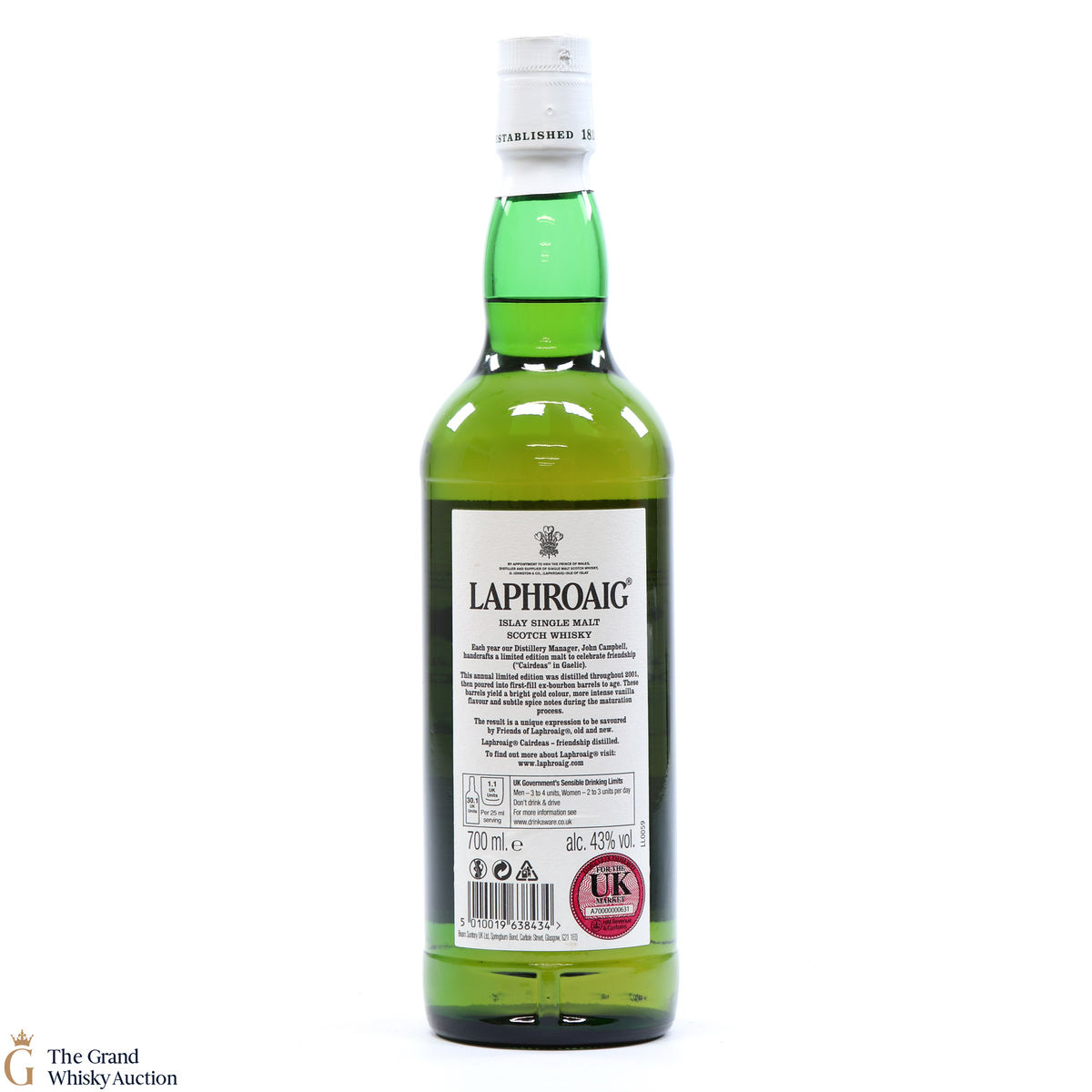 Distilled throughout the year of 2001, this 15 year old Laphroaig single malt was released as the annual Cairdeas line of bottlings.