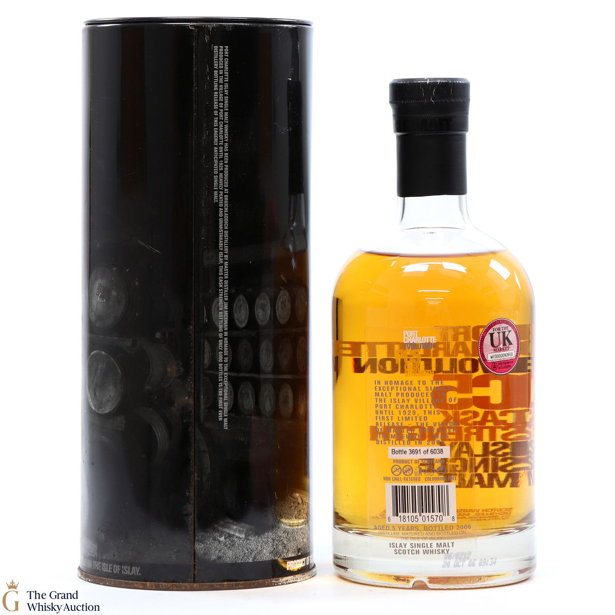 Port Charlotte PC5, produced by Bruichladdich Distillery, is a heavily peated spirit. It was the first release of heavily peated Port Charlotte and was produced in 2001 from some of the first spirits to be produced after the distillery's reopening. The single malt was bottled at 5 years old in 2006 and was limited to 6038 bottles.