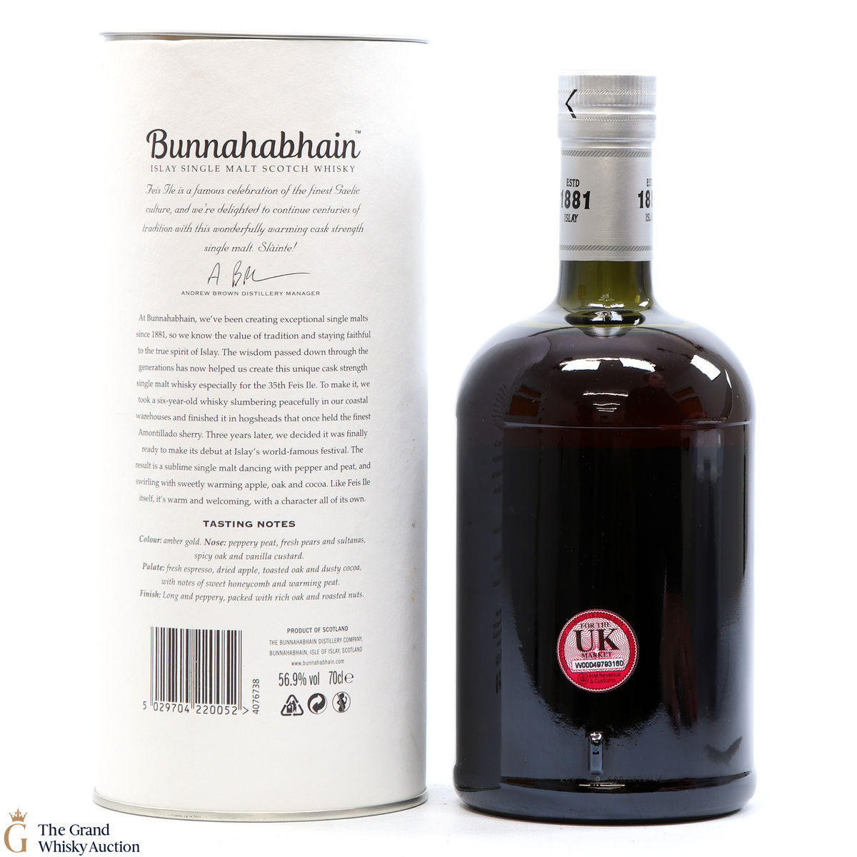This limited edition single malt from Bunnahabhain Distillery was matured for 6 years in classic bourbon barrels, after which the single malt was transferred to Amontillado sherry Hogsheads for another three years. It was bottled at 56.9% and was released by Bunnahabhain for Fèis Ìle 2020. This is one of only 1658 bottles produced.