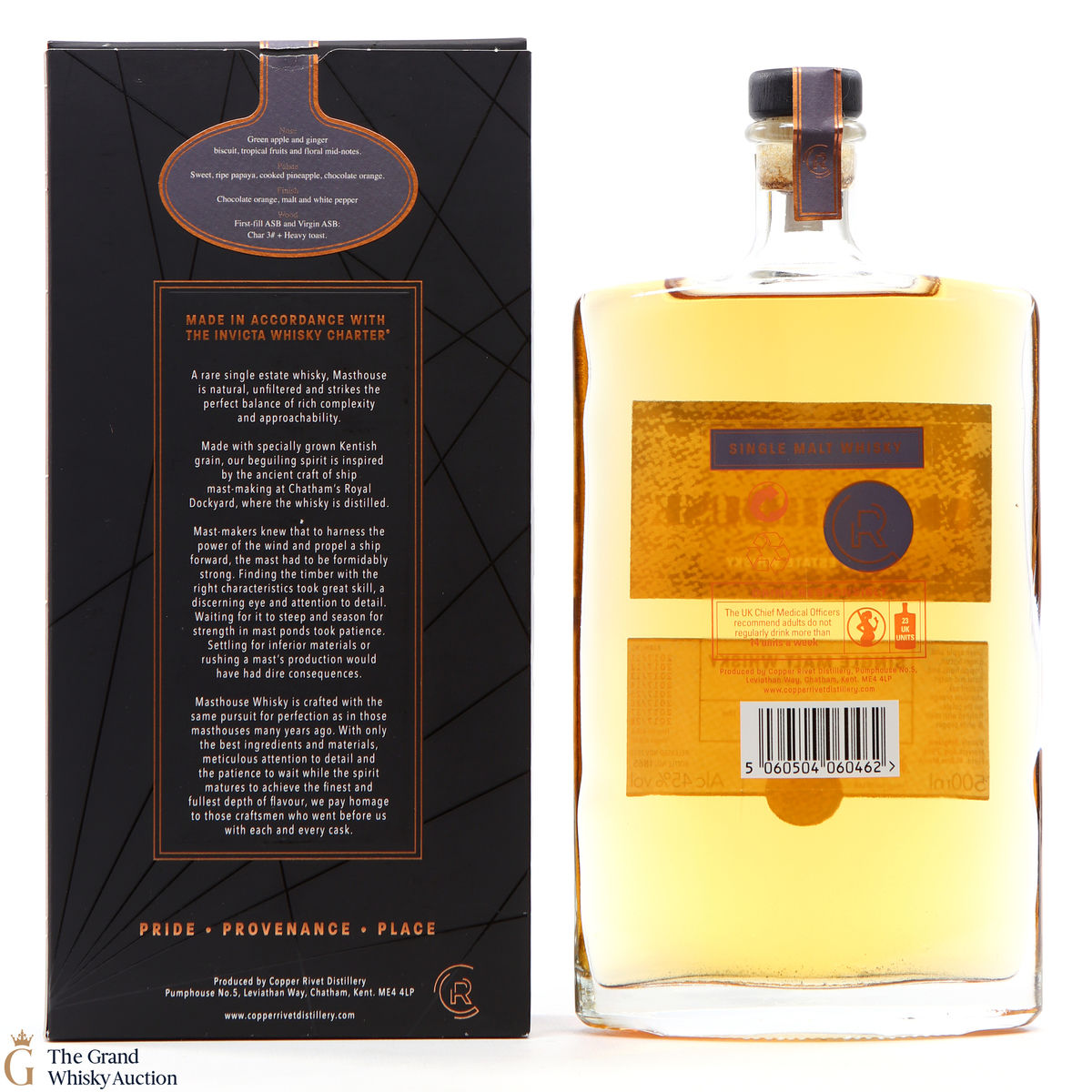 Masthouse Single Malt, made in accordance with the distillery's very own Invicta Whisky Charter. This expression is distilled from Kentish malted barley from the nearby Isle of Sheppey, and was aged in a combination of ex-bourbon and virgin American white oak barrels.