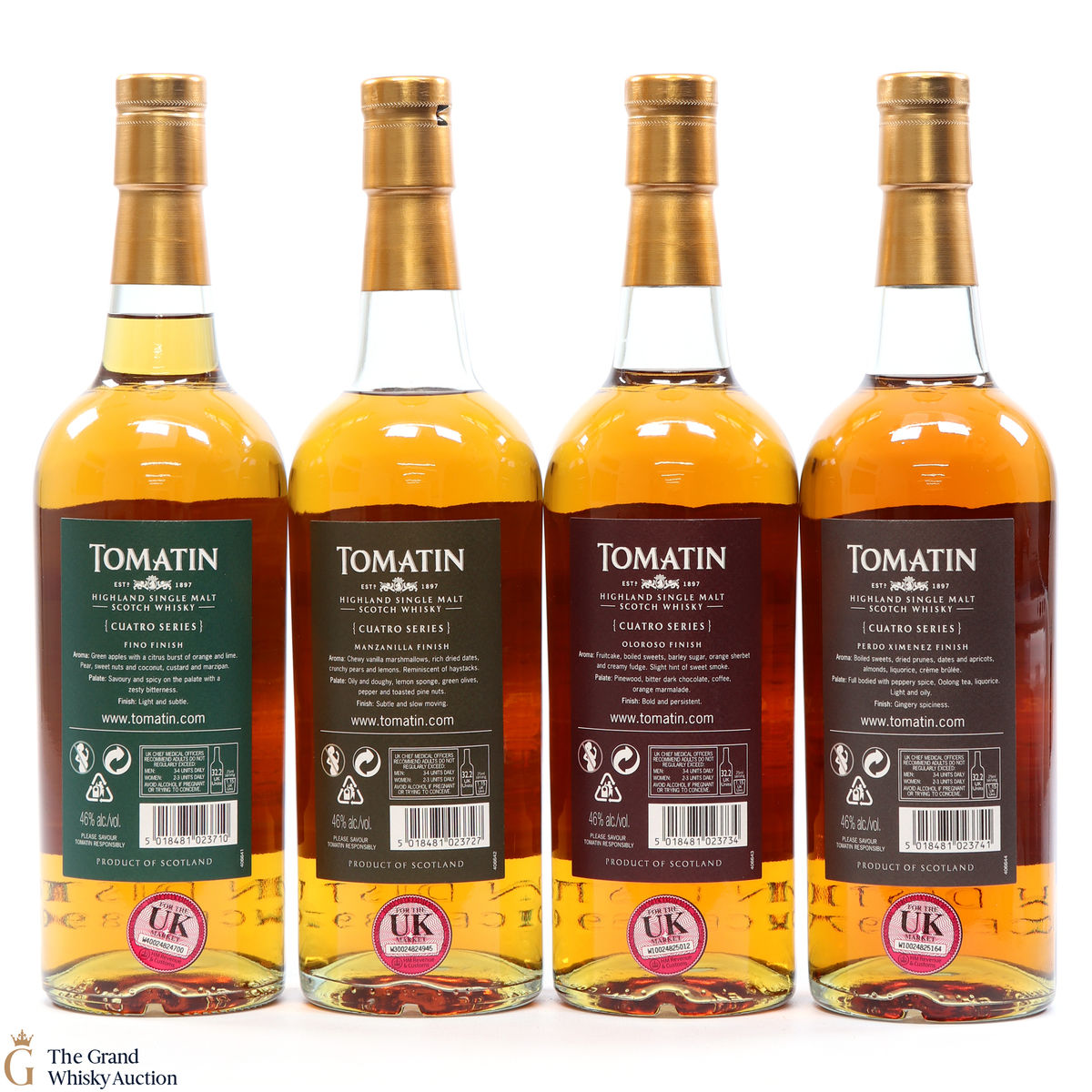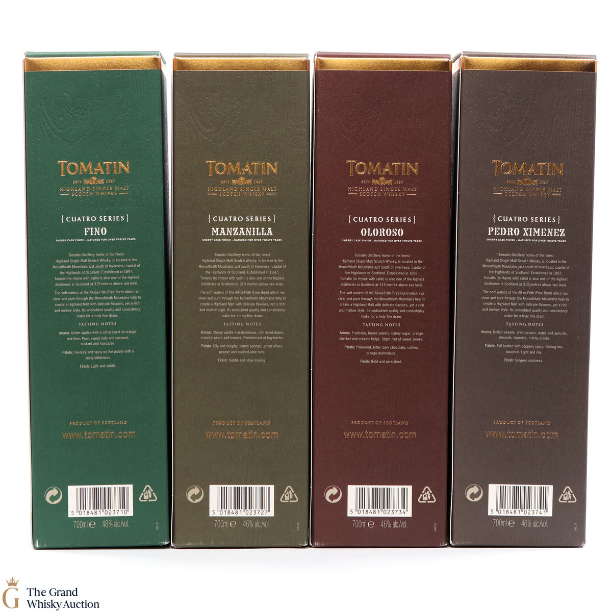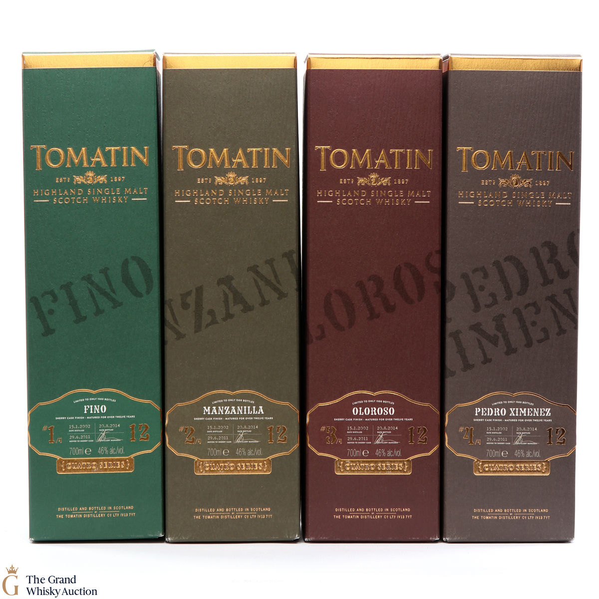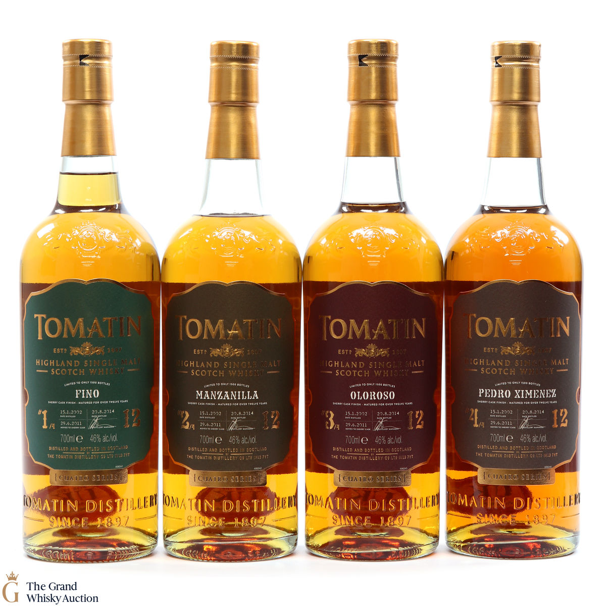 Included in this lot are all 4 bottles that make up the Cuatro Series from the Tomatin Distillery: