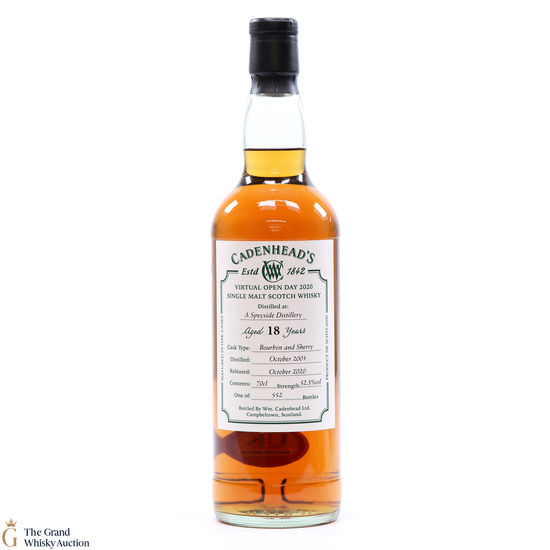 Distilled in 2001 at an undisclosed distillery in Speyside and bottled by Cadenhead's. The annual Campbeltown Whisky Festival couldn't take place due to Covid19, so, they did a Virtual Open Day and this was one of the open day. This release was matured in a combination of bourbon and sherry casks for 18 years - this is one of just 552 bottles released at a strength of 52.3% abv.