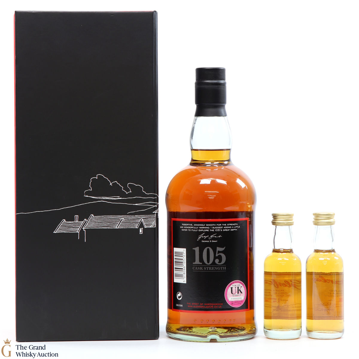 Well presented this Glenfarclas 105 Tasting Pack contains 1 x 70cl bottle of 105 and 2 x 5cl bottles (1 x 15 Year Old and 1 x 21 Year Old). All presented in a nice presentation box, bottle on display and the minatures kept in a draw below.