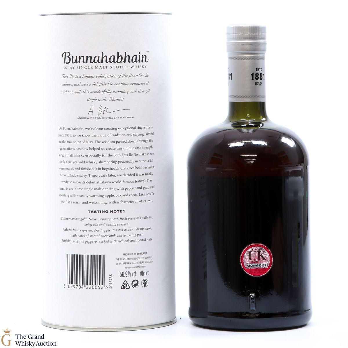 This limited edition single malt from Bunnahabhain Distillery was matured for 6 years in classic bourbon barrels, after which the single malt was transferred to Amontillado sherry Hogsheads for another three years. It was bottled at 56.9% and was released by Bunnahabhain for Fèis Ìle 2020. This is one of only 1658 bottles produced.