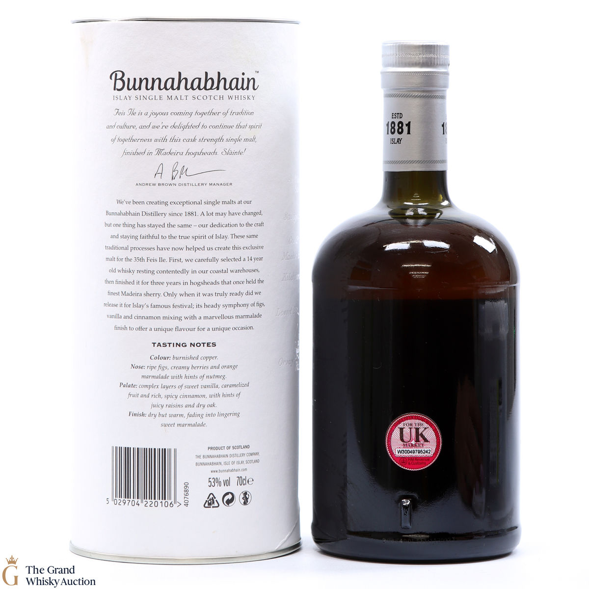 This limited edition single malt from Bunnahabhain Distillery was matured for 14 years in classic bourbon barrels, then finished in Madeira casks for another three years. Bottled at 53%, and released by Bunnahabhain for the 25th anniversary of Fèis Ìle - Fèis Ìle 2020. This is one of only 1164 bottles produced.