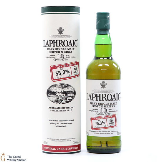 This bottling is from batch 003, original cask strength bottling of the medicinal 10-year-old from Islay's bestselling distillery, Laphroaig. In making Laphroaig, malted barley is dried over a peat fire. The smoke from this peat, found only on Islay, gives Laphroaig its particularly rich flavour. This release was bottled at 55.3% in January 2011.