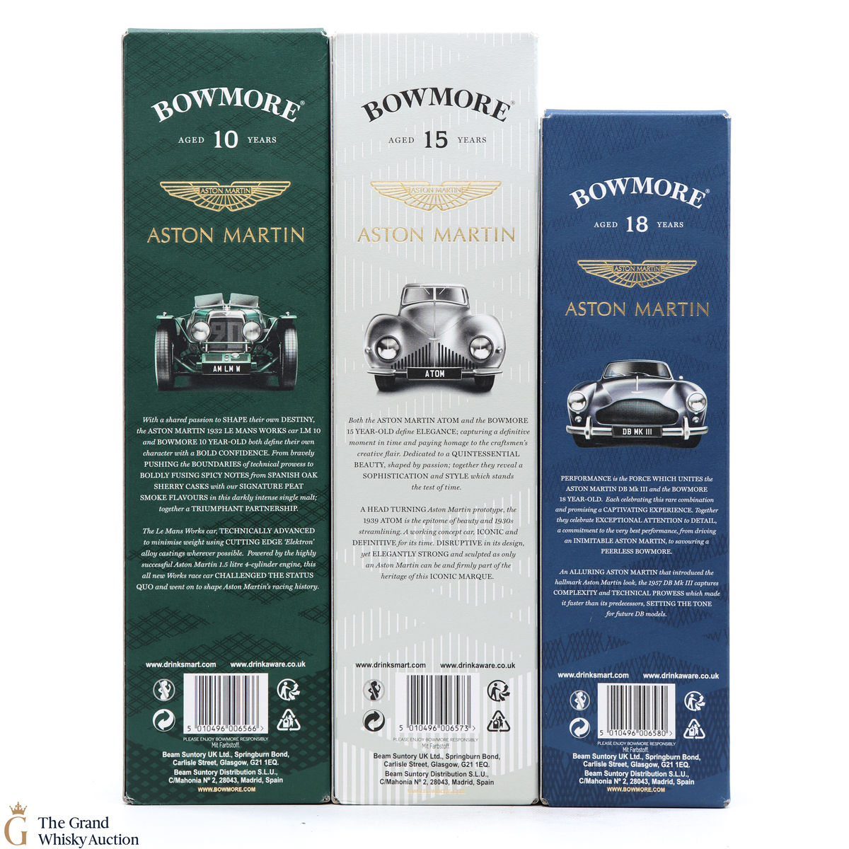 The full collection of the collaboration between Bowmore and Aston Martin, both creating timeless beauty and a lasting legacy. Each edition of the Aston Martin collection features a different car. Included in this lot is edition 1, 2 and 3: