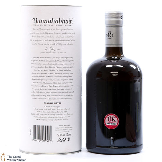 This limited edition single malt from Bunnahabhain Distillery has been matured for 17 years. For the last 5 years, the whisky was finished in Sauternes hogsheads. This release is one of 3 by Bunnahabhain for Fèis Ìle 2019. It has been bottled at 54.2% ABV. This is one of only 1118 bottles produced.